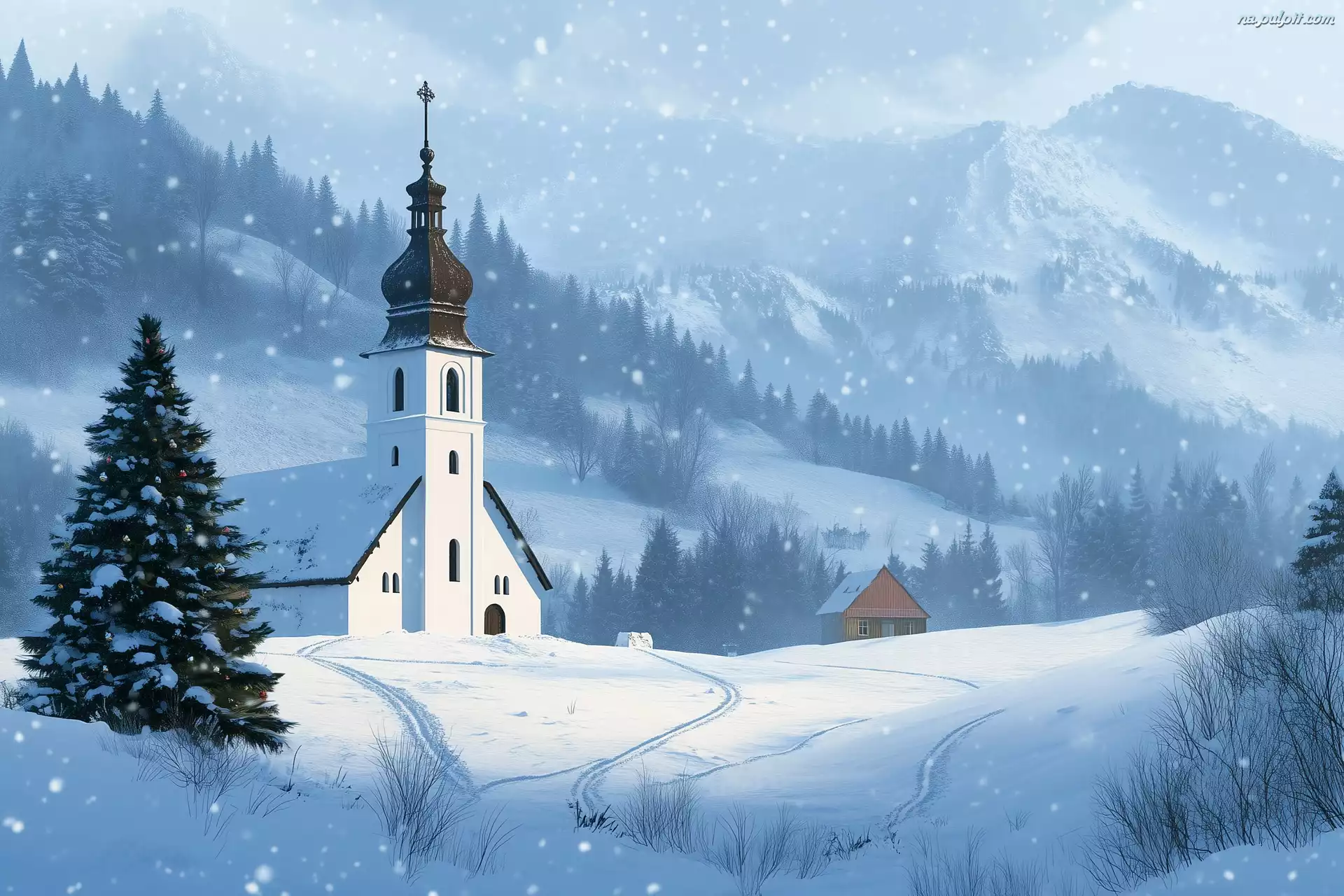 Choinka, Zima, Biały, Góry, Kościół
