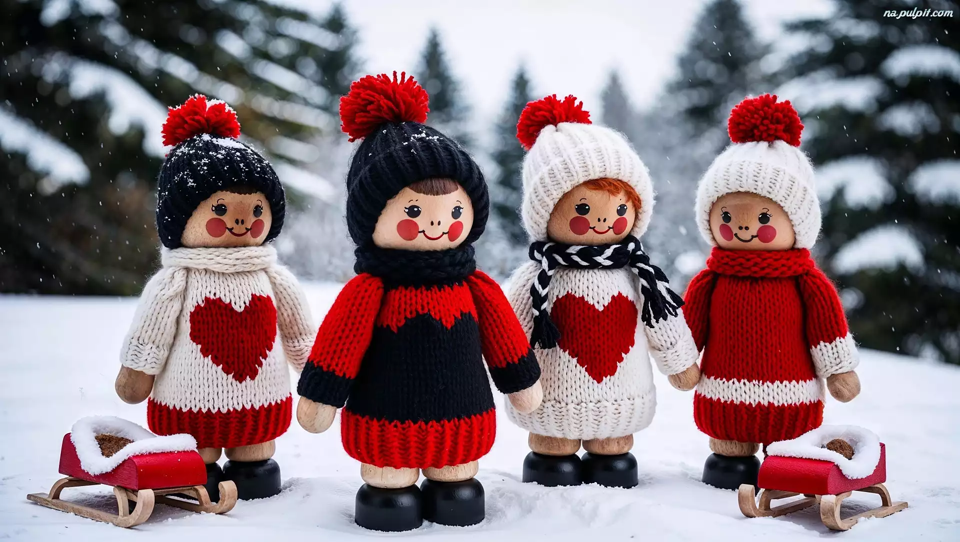 Grafika, Swetry, Czapki, Zima, Drewniane, Lalki, Sanki Na Pulpit