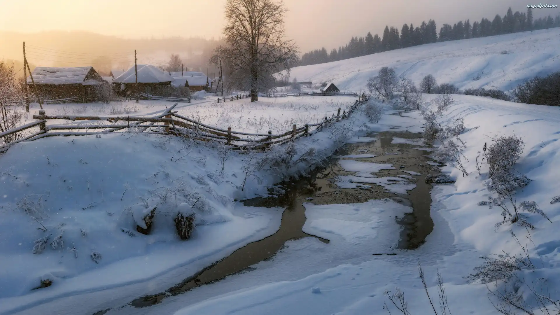 Ogrodzenie, Rzeka, Domy, Zima, Śnieg, Drzewa, Wzgórza