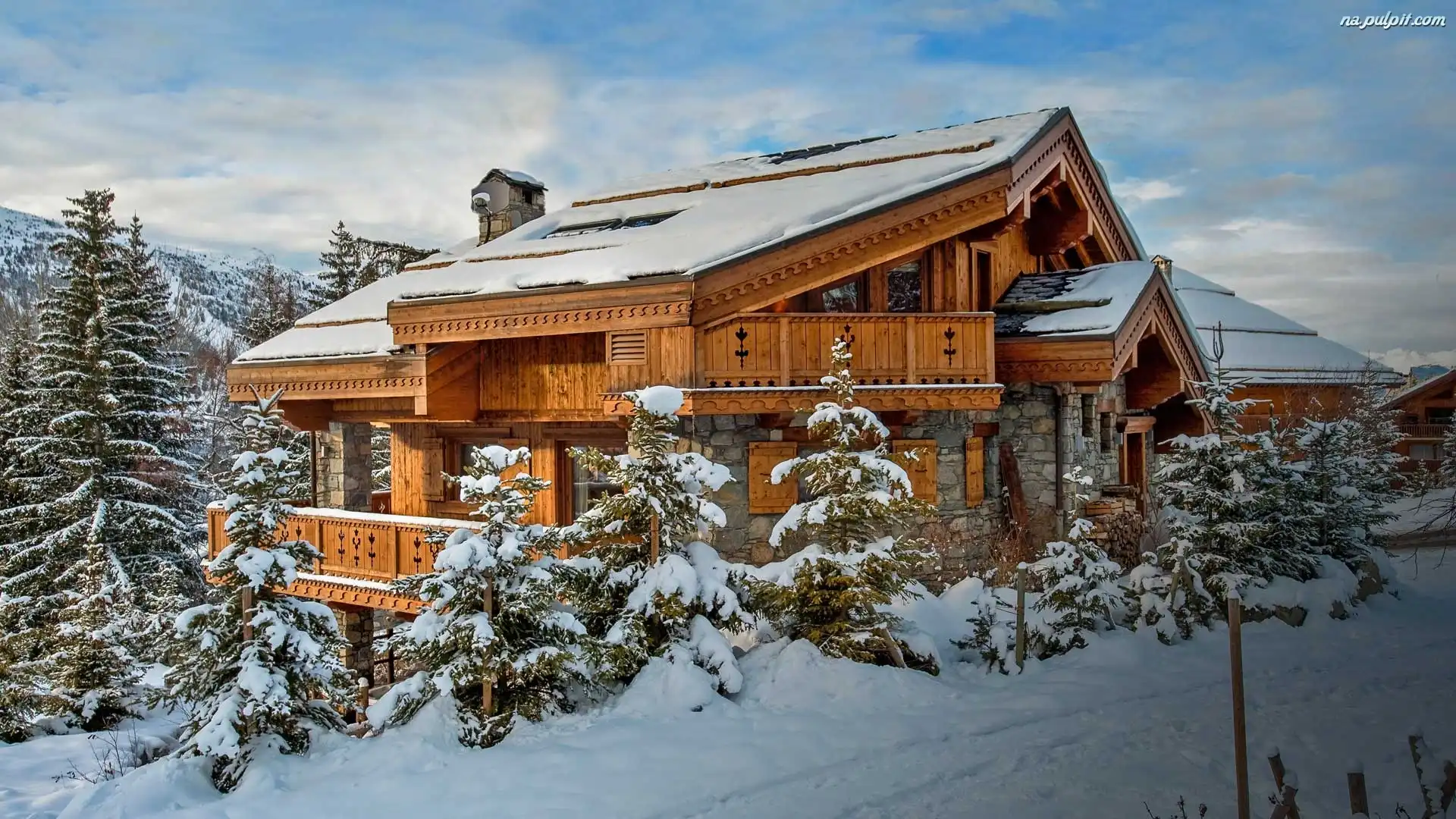 Zima, Dom, Drewniany, Drzewa Na Pulpit