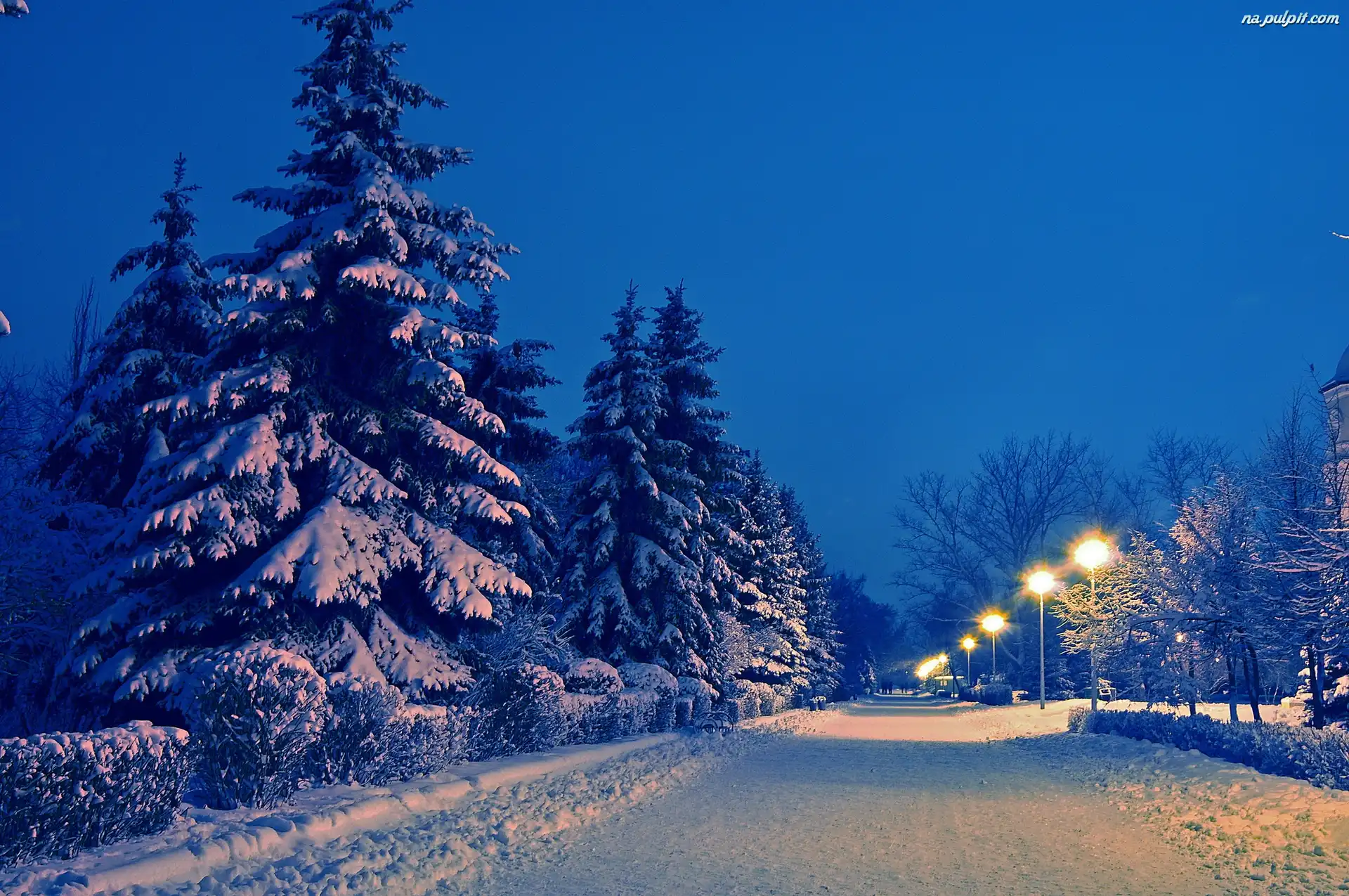 Zima, Drzewa, Droga, Latarnie Na Pulpit