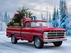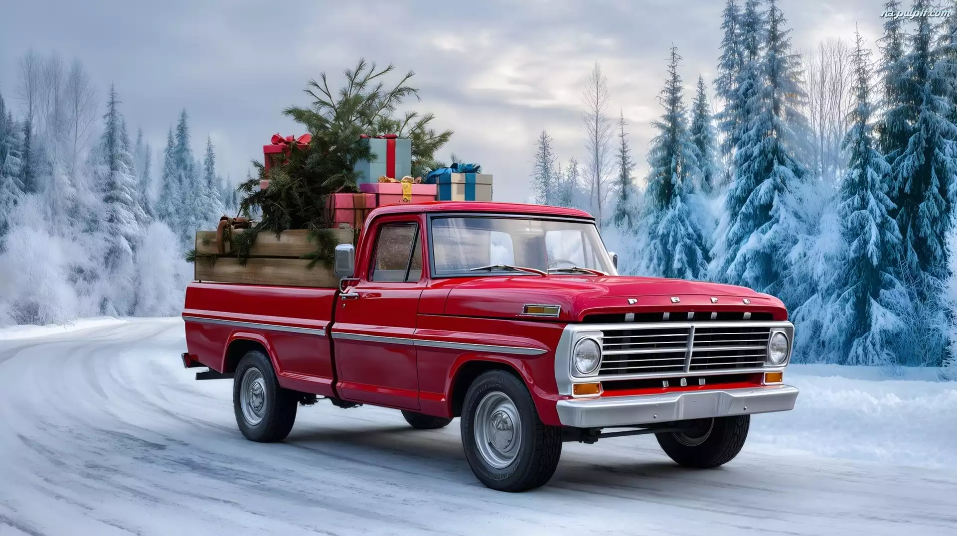 Zima, Pickup, Grafika, Ford, Choinka, Las, Czerwony, Prezenty, Droga, ÅšwiÄ…teczne Na Pulpit
