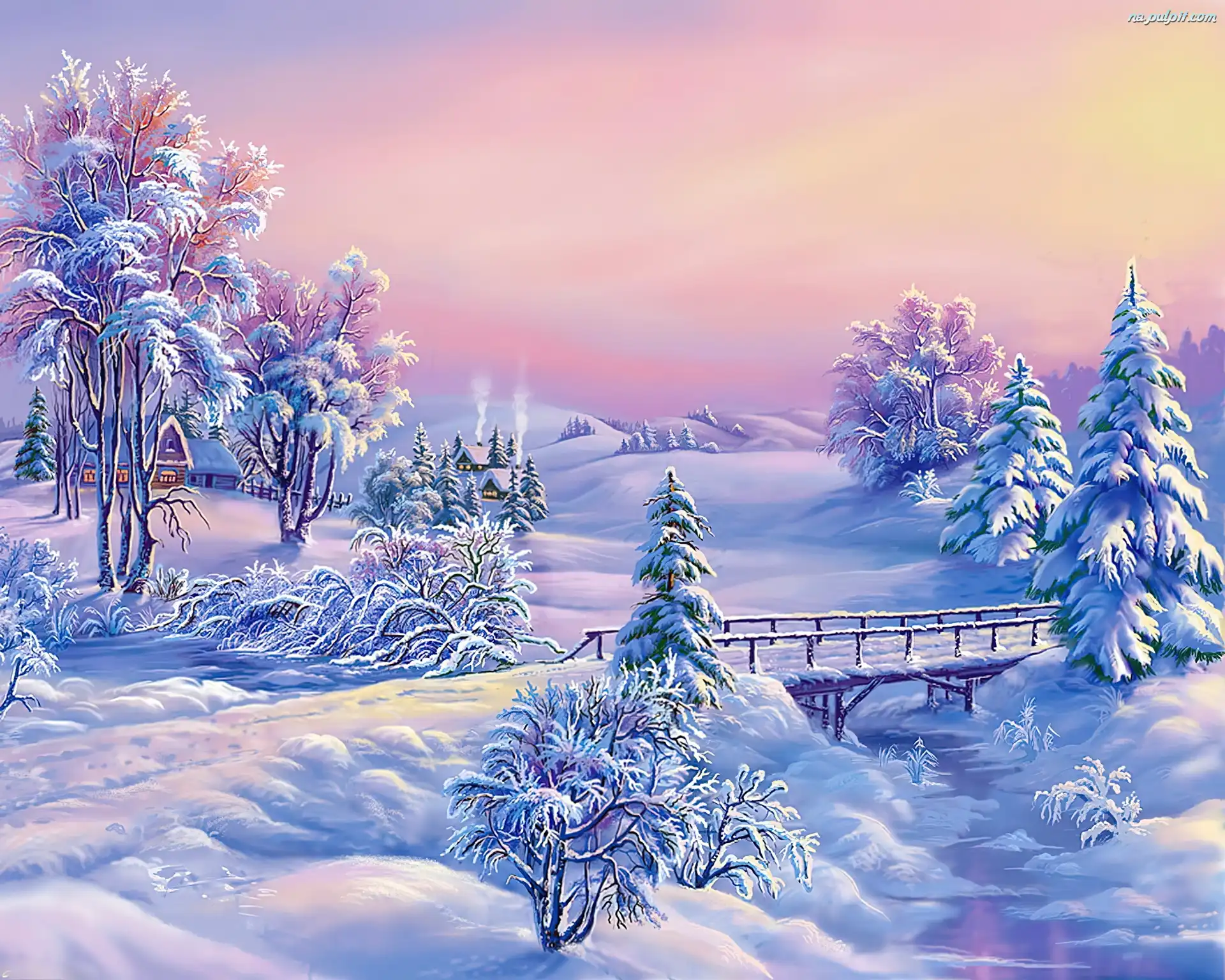 Zima, Domki, Drzewa, Śnieg Na Pulpit