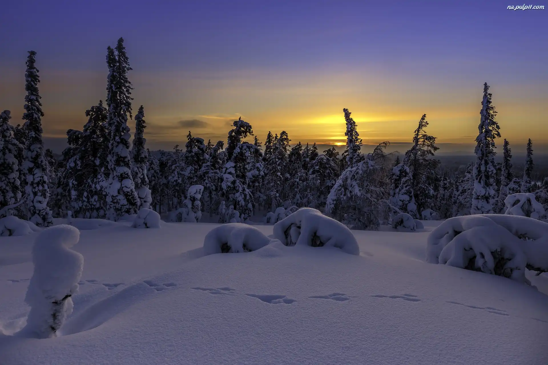 Ślady, Drzewa, Śnieg, Zachód słońca, Zaspy, Ośnieżone, Zima Na Pulpit