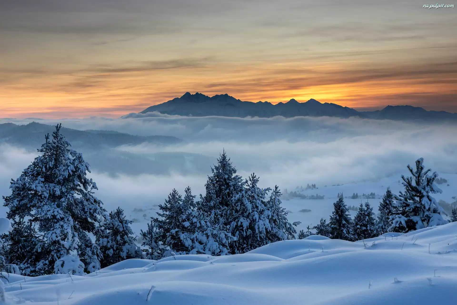 Góry, Mgła, Drzewa, Zima, Śnieg, Ośnieżone, Poranek Na Pulpit
