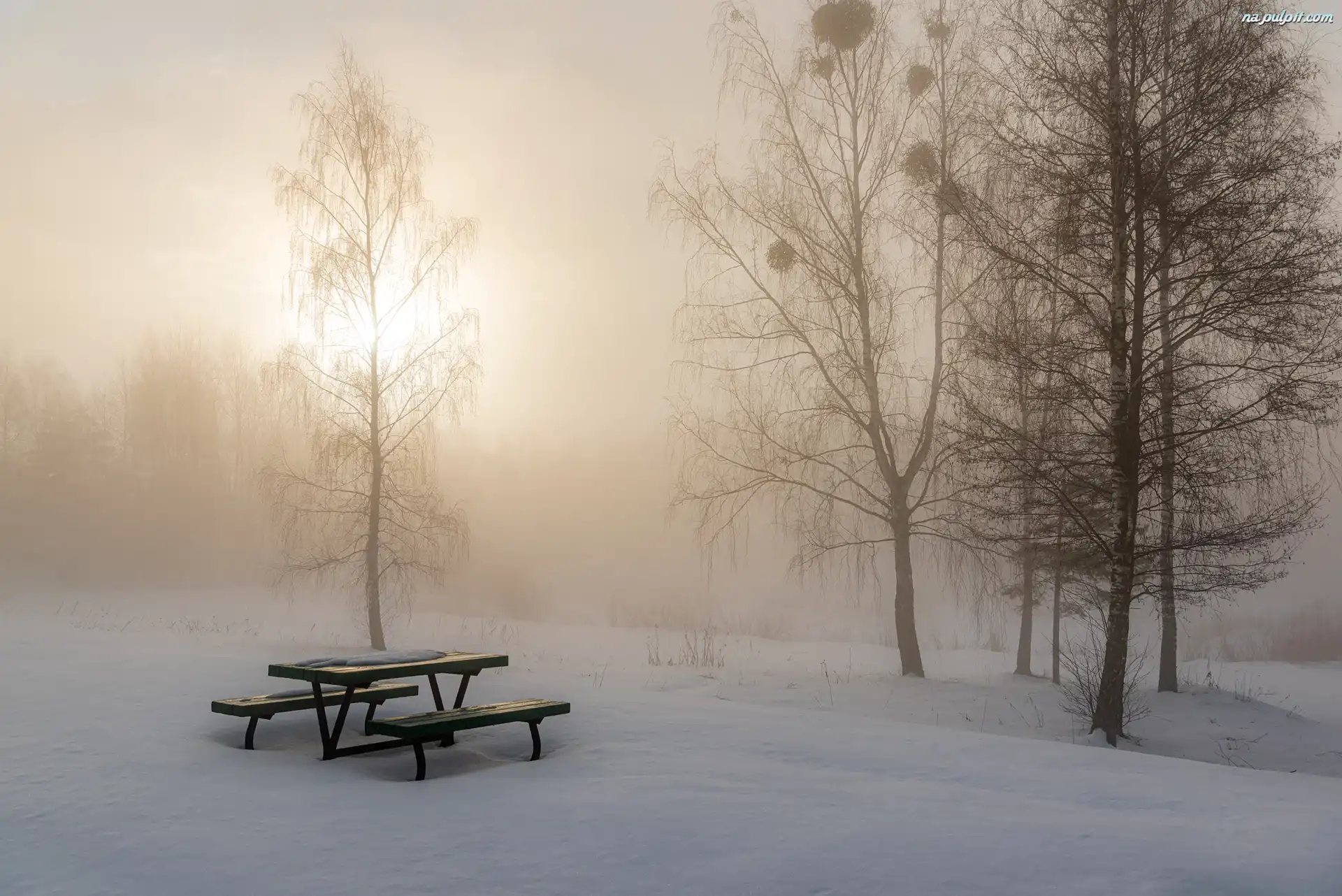 Ławka, Drzewa, Śnieg, Zima, Mgła Na Pulpit