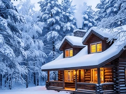 Śnieg, Oświetlony, Drzewa, Zima, Las, Ośnieżone, Dom