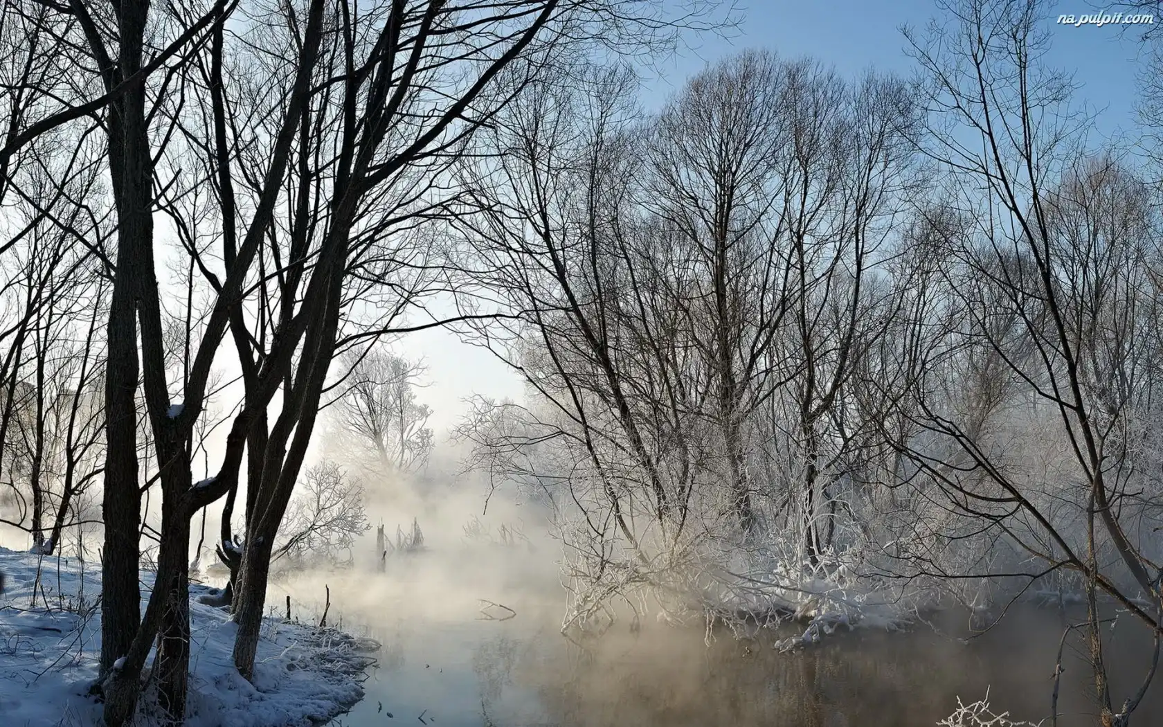 Zima, Rzeka, Drzewa, Mgła Na Pulpit