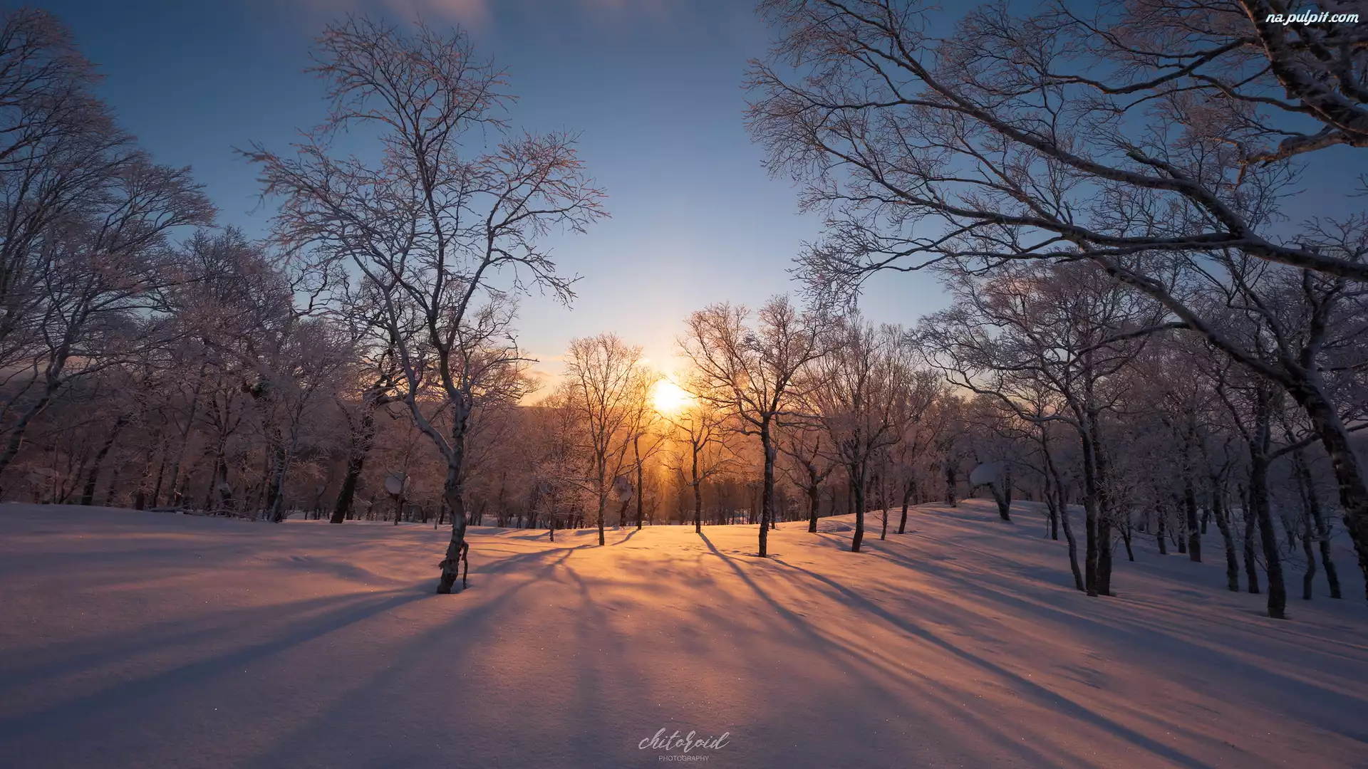 Drzewa, Wschód słońca, Zima Na Pulpit