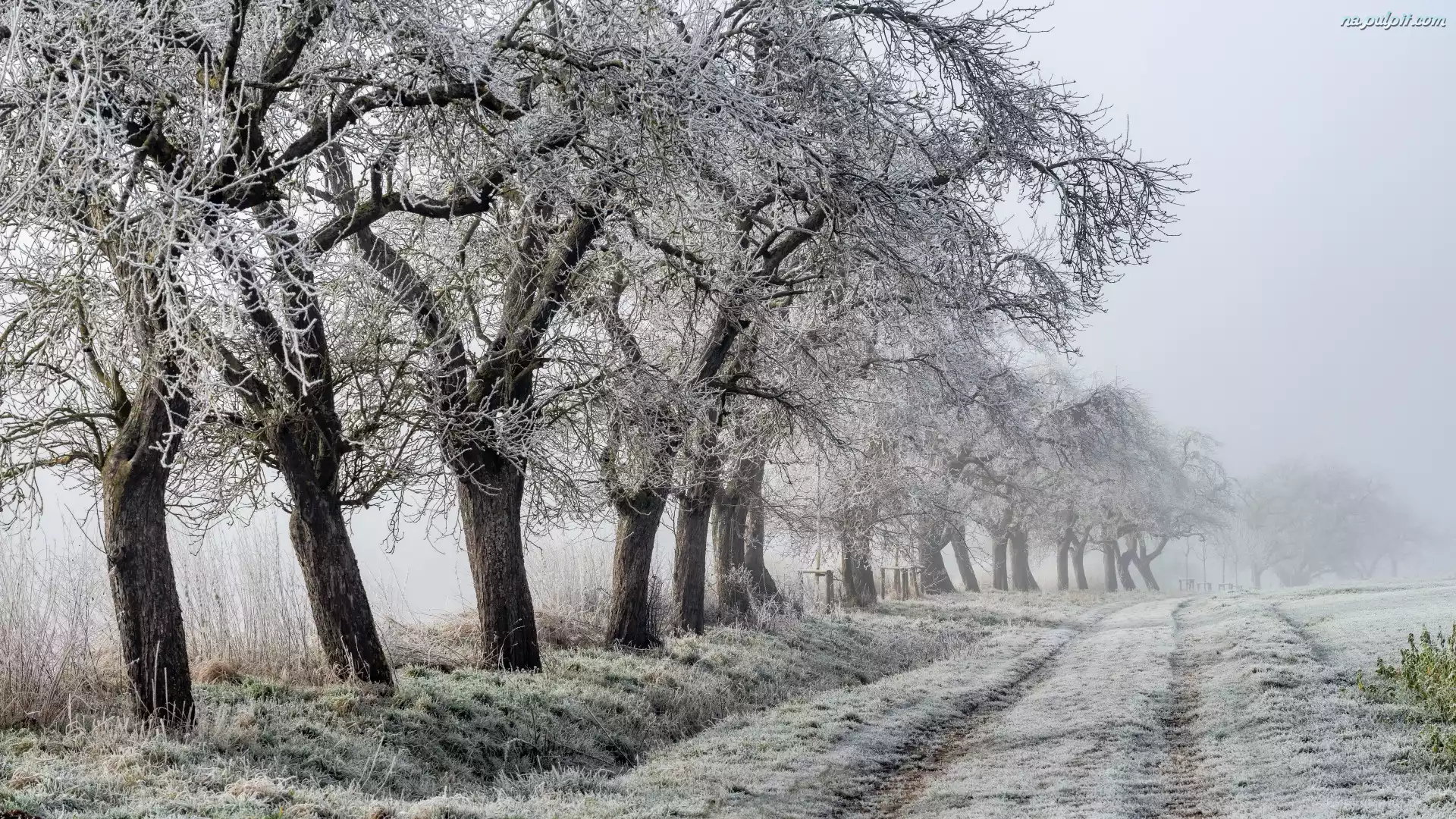 Poranek, Trawa, Drzewa, Zima, Droga, Oszronione, Mgła Na Pulpit
