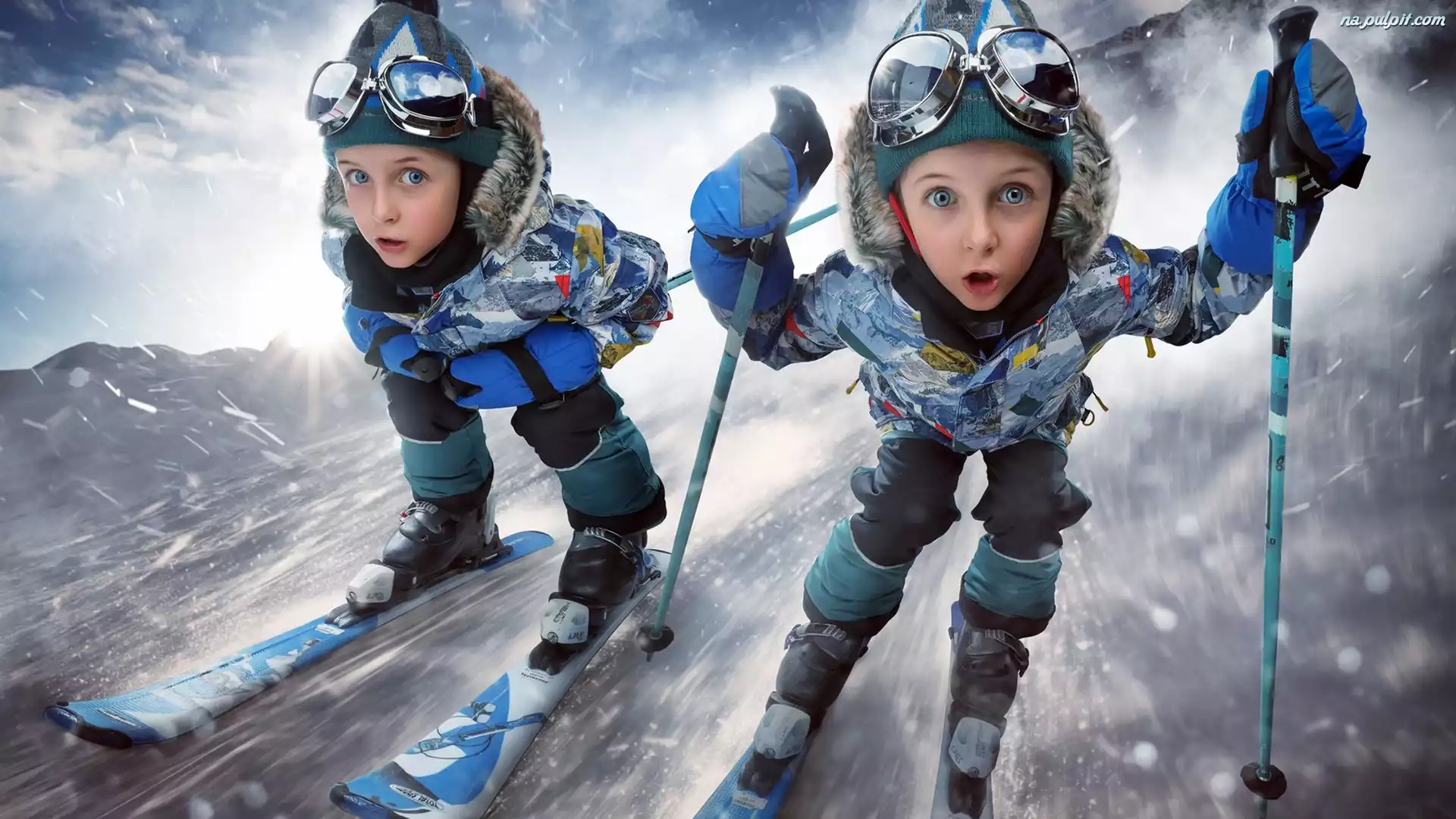 Zima, Dziewczynki, Dwie, Dzieci, Narty Na Pulpit