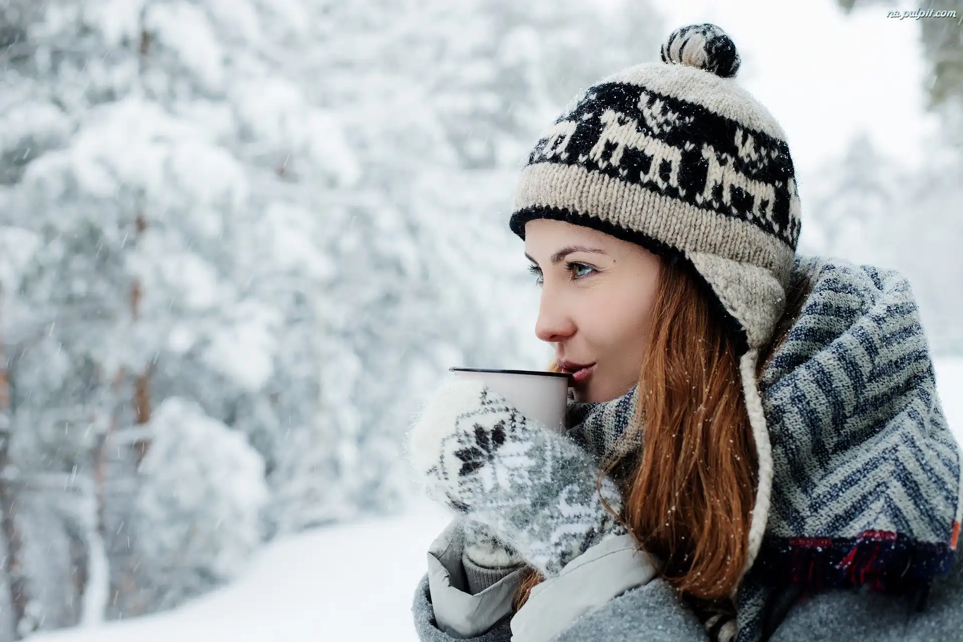 Zima, Rękawiczki, Czapka, Dziewczyna, Kubek