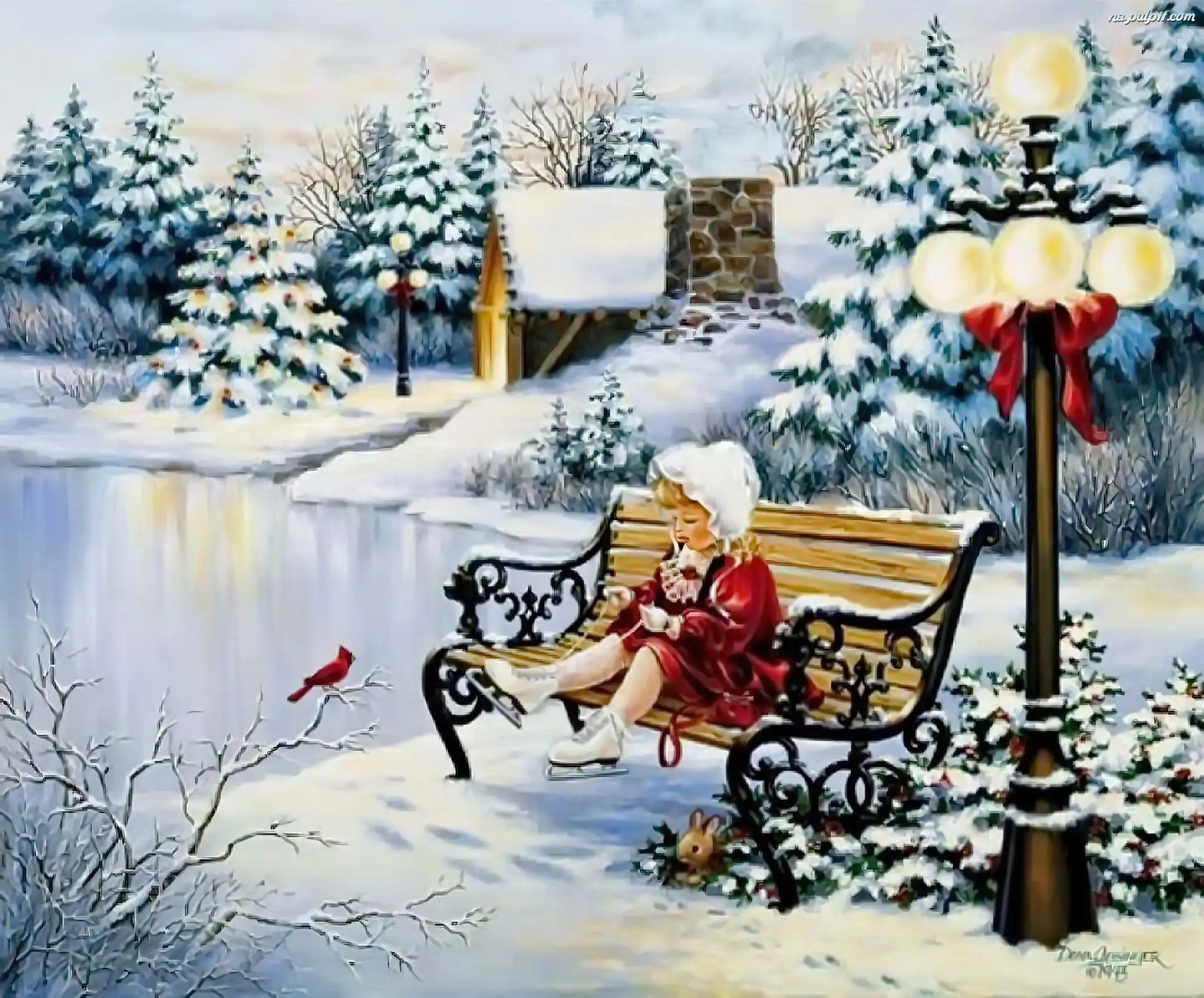 Zima, Lodowisko, Ławka, Dziewczynka, Łyżwy Na Pulpit
