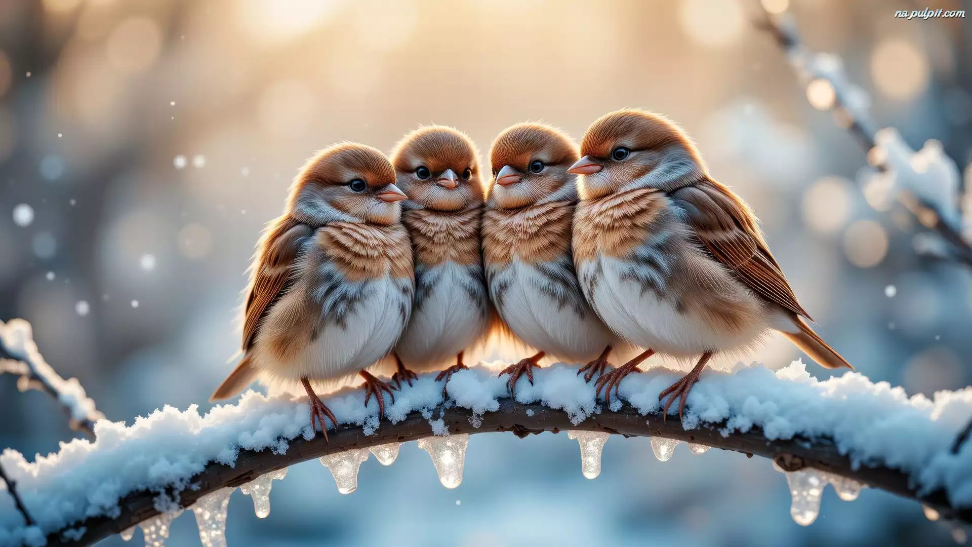 Grafika, Śnieg, Gałąź, Zima, Cztery, Ptaki, Sople Na Pulpit