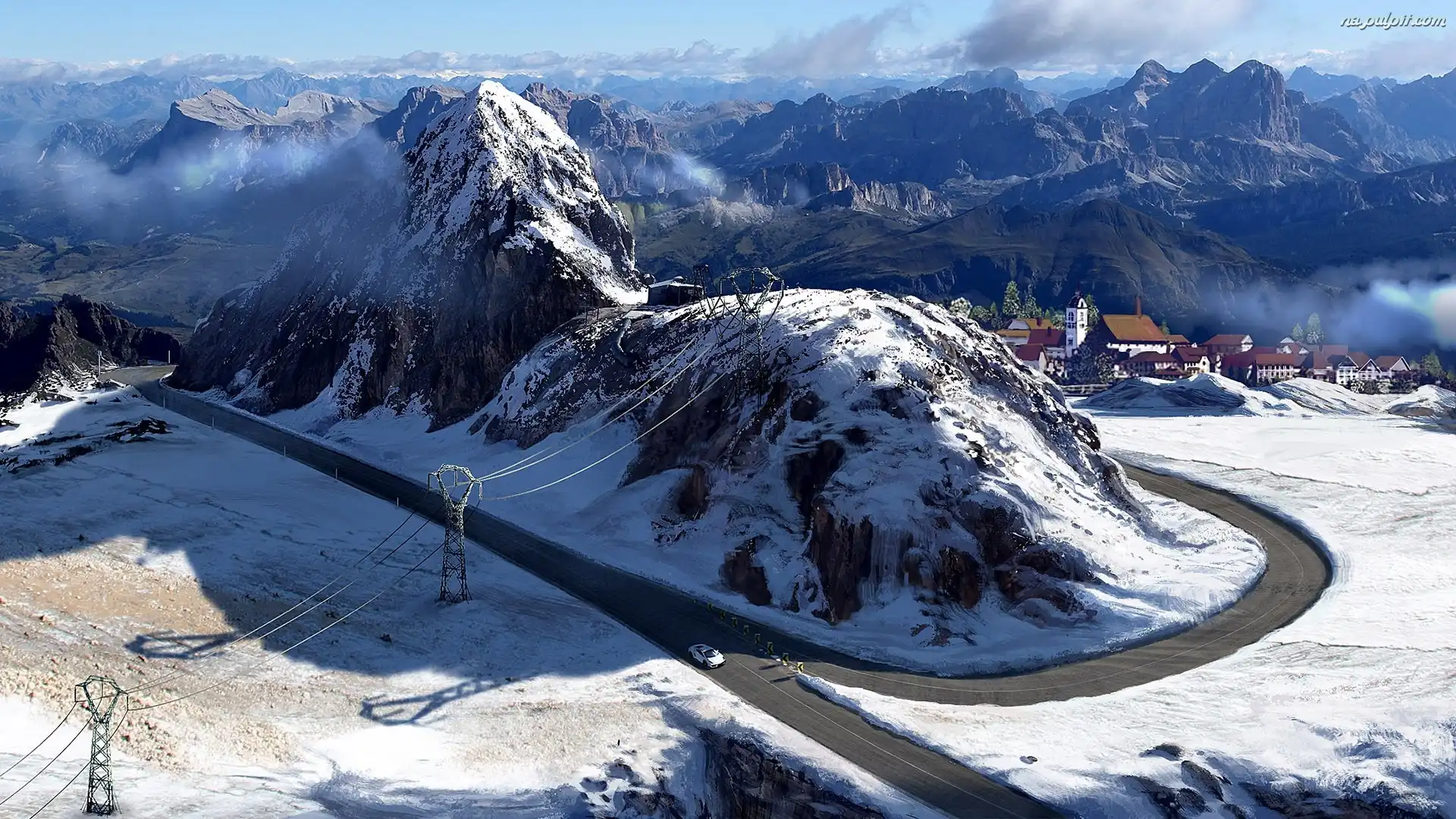 Zima, Chmury, Droga, Góry, Budynki Na Pulpit
