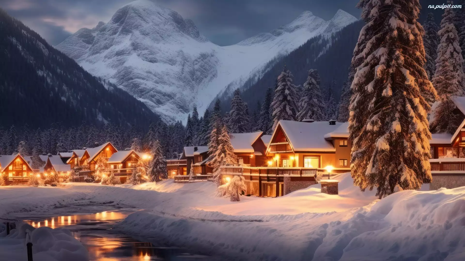 Domy, Zima, Góry, Światła, Las Na Pulpit