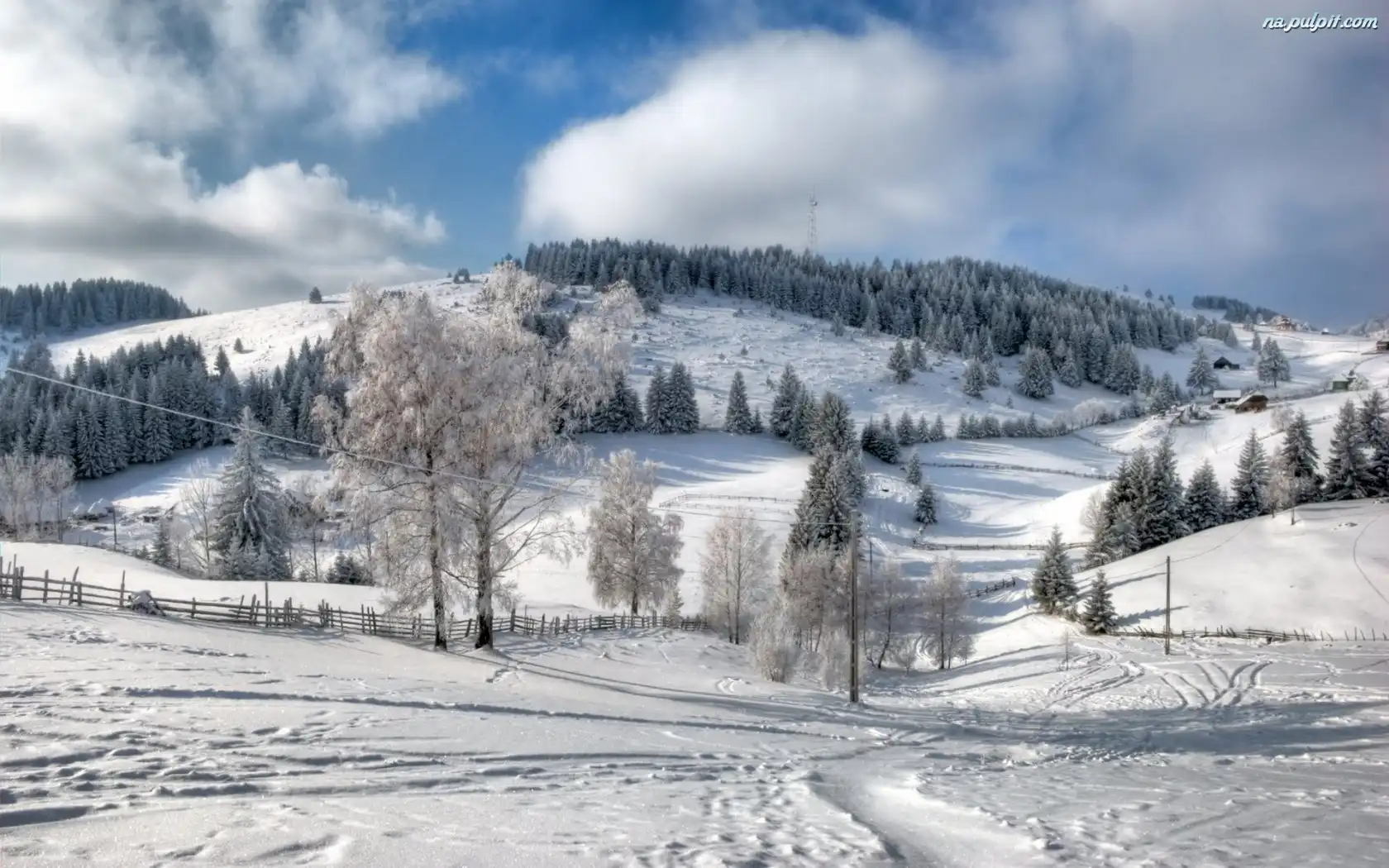 Zima, Drzewa, Lasy, Góry, Domy Na Pulpit