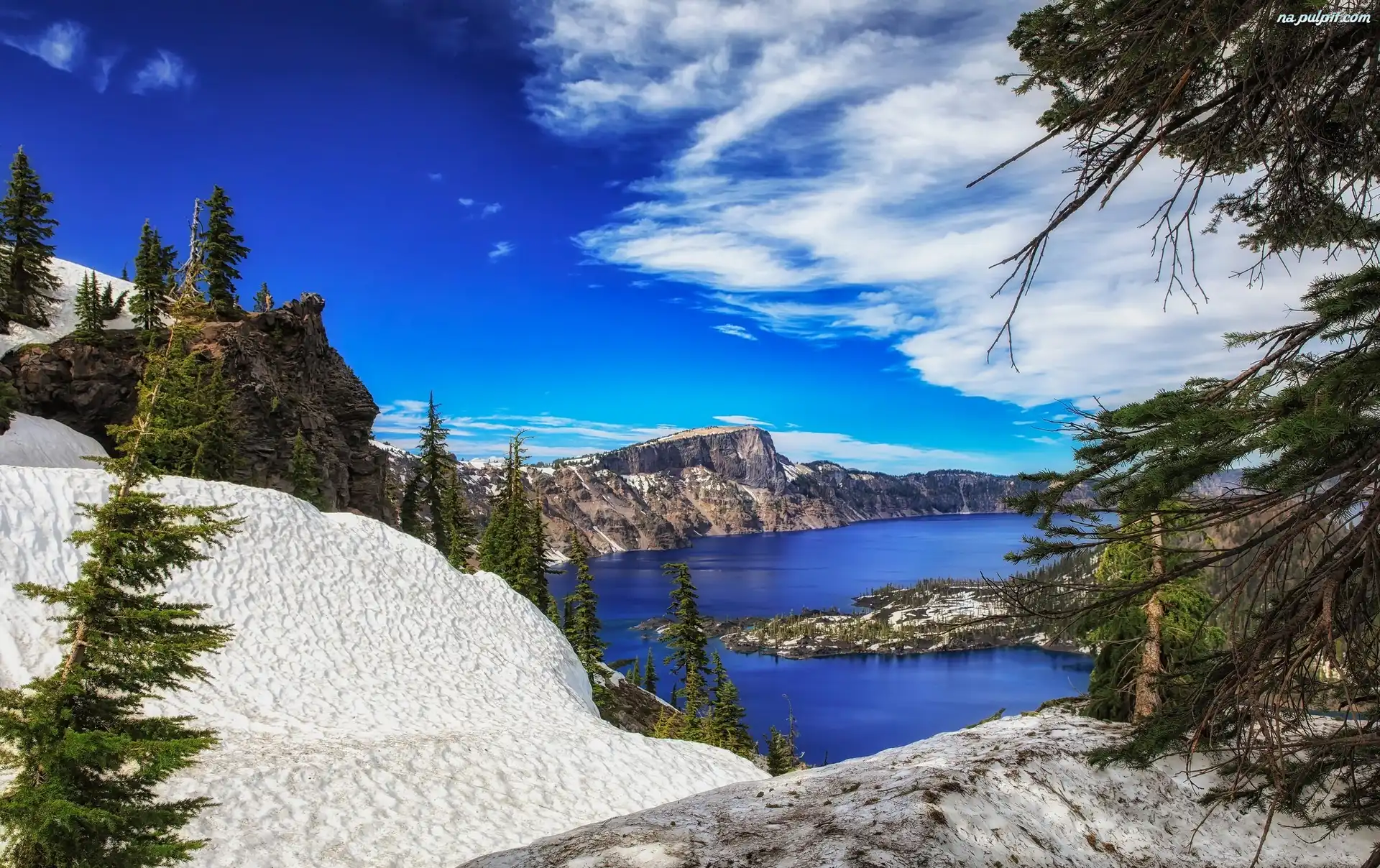 Drzewa, Stan Oregon, Lasy, Góry, Jezioro Kraterowe, Stany Zjednoczone, Zima