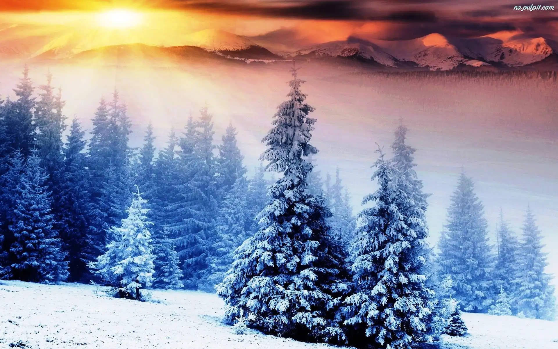 Zima, Słońca, Promienie, Góry, Świerki Na Pulpit