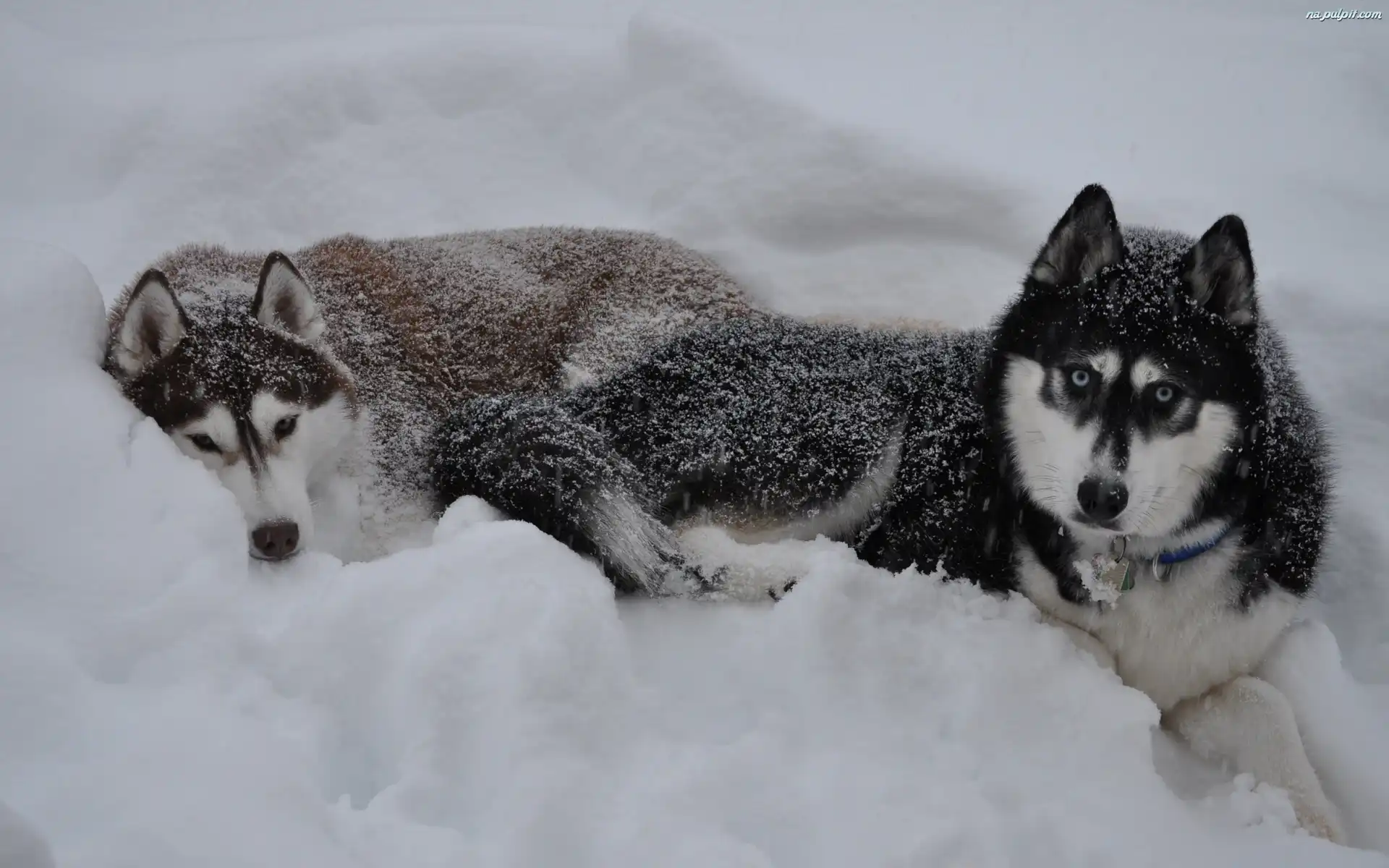Zima, Psy, Siberian Husky, Åšnieg Na Pulpit