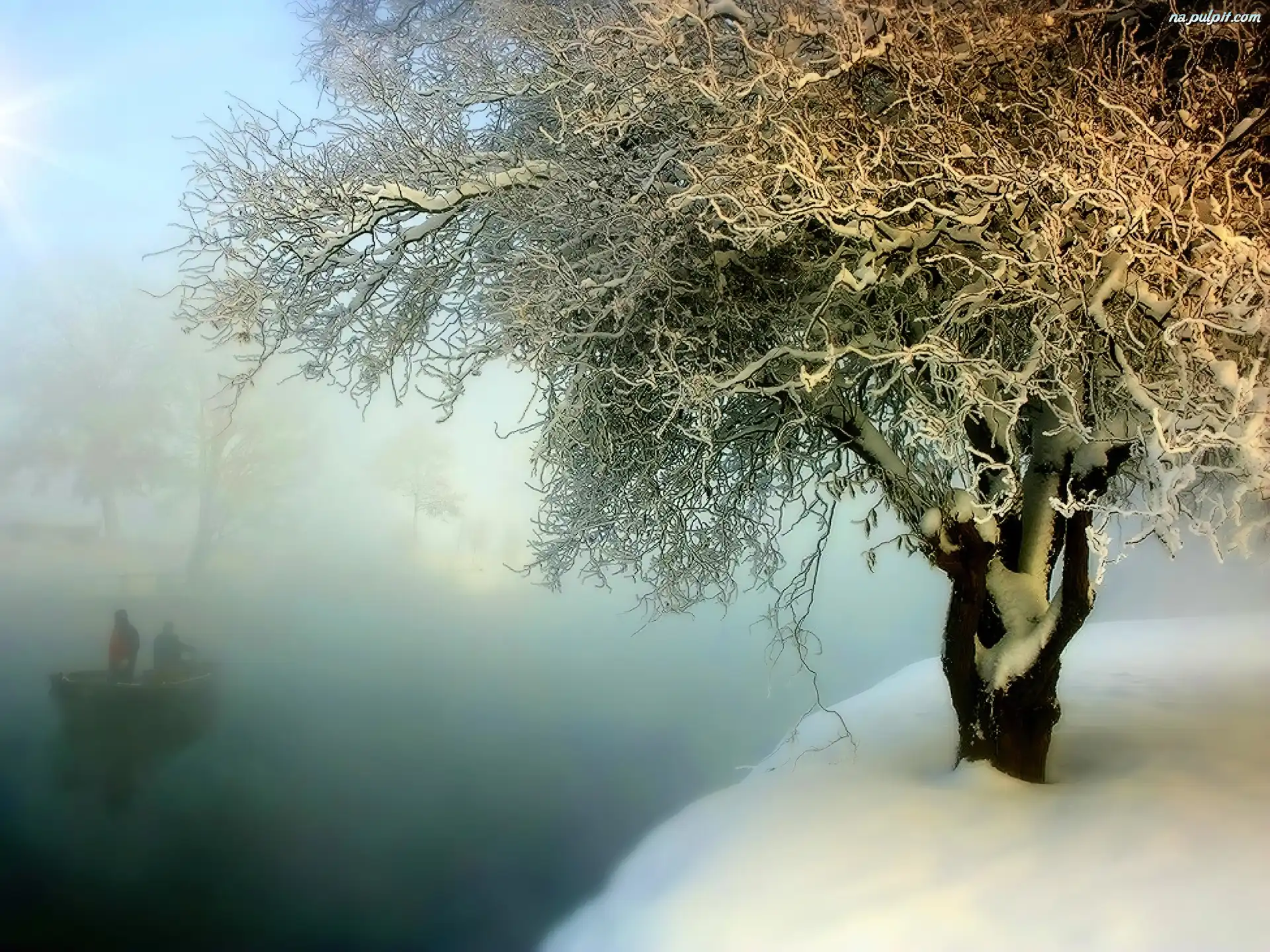 Zima, Mgła, Jeziora, Drzewo Na Pulpit