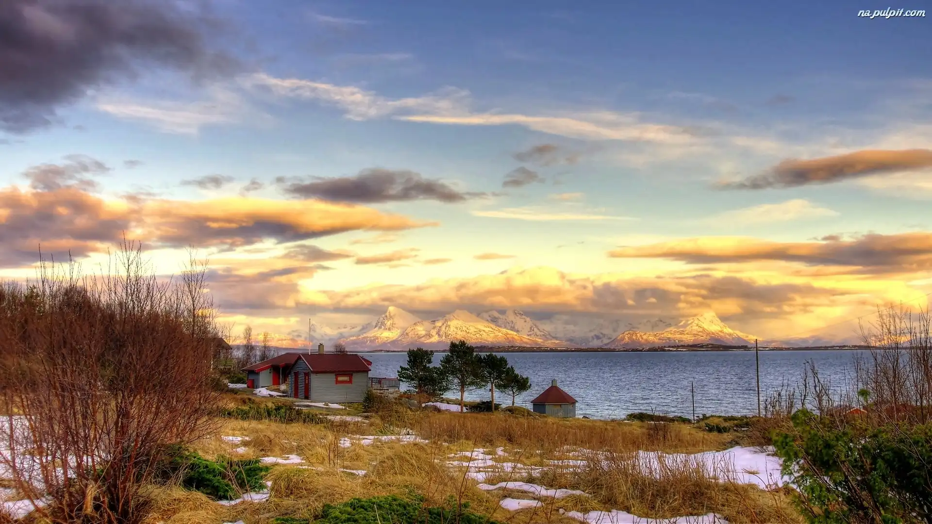 Zima, Domy, Góry, Jezioro, Chmury Na Pulpit