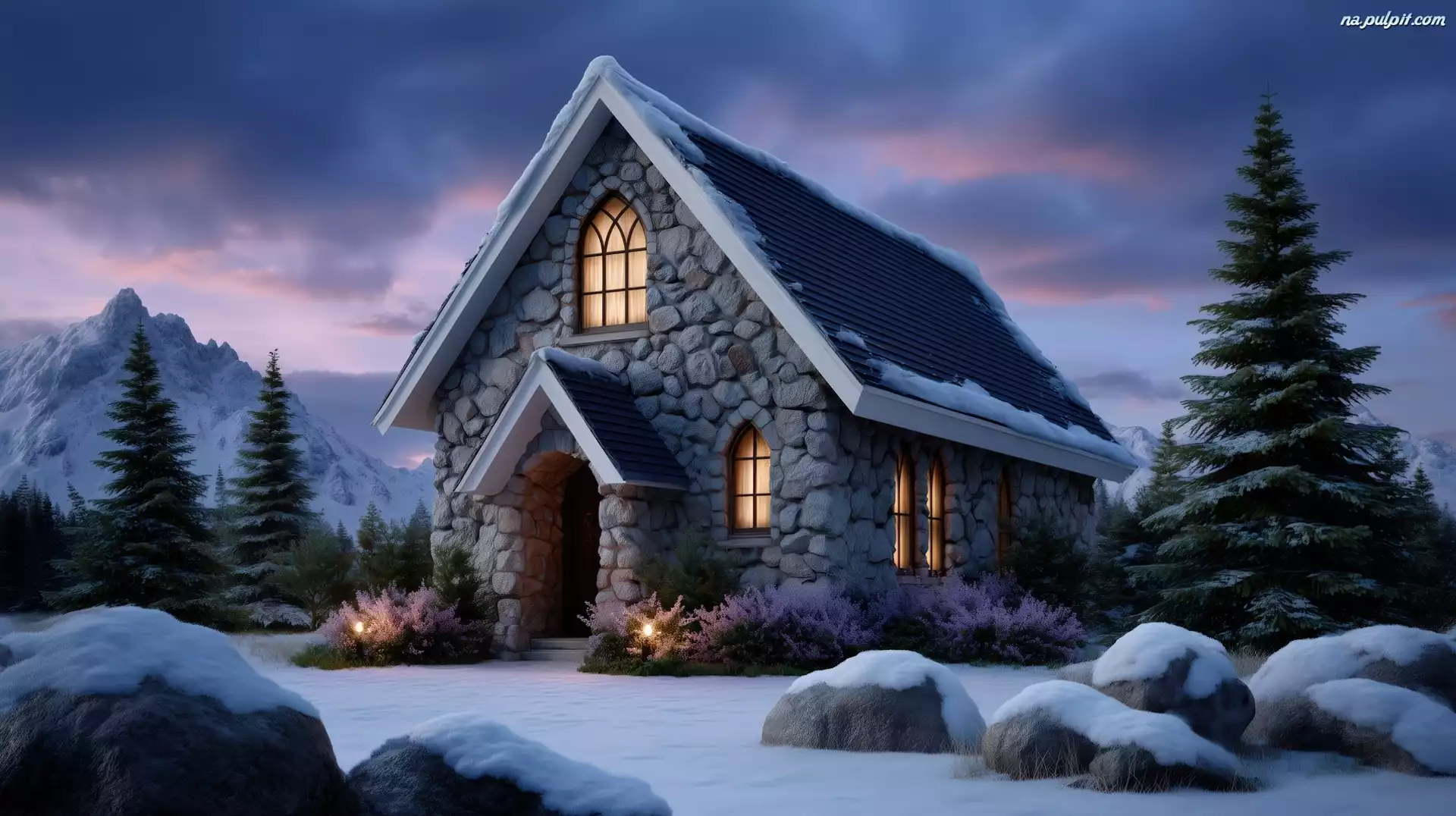 Drzewa, Kamienny, Góry, Zima, Dom, Kamienie Na Pulpit