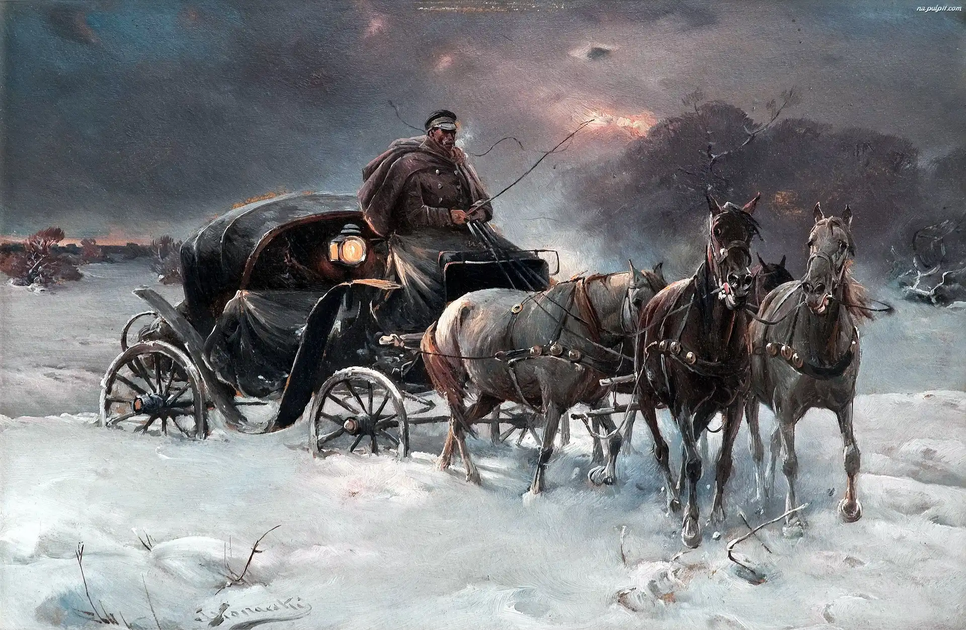Zima, Woźnica, Konie, Powóz