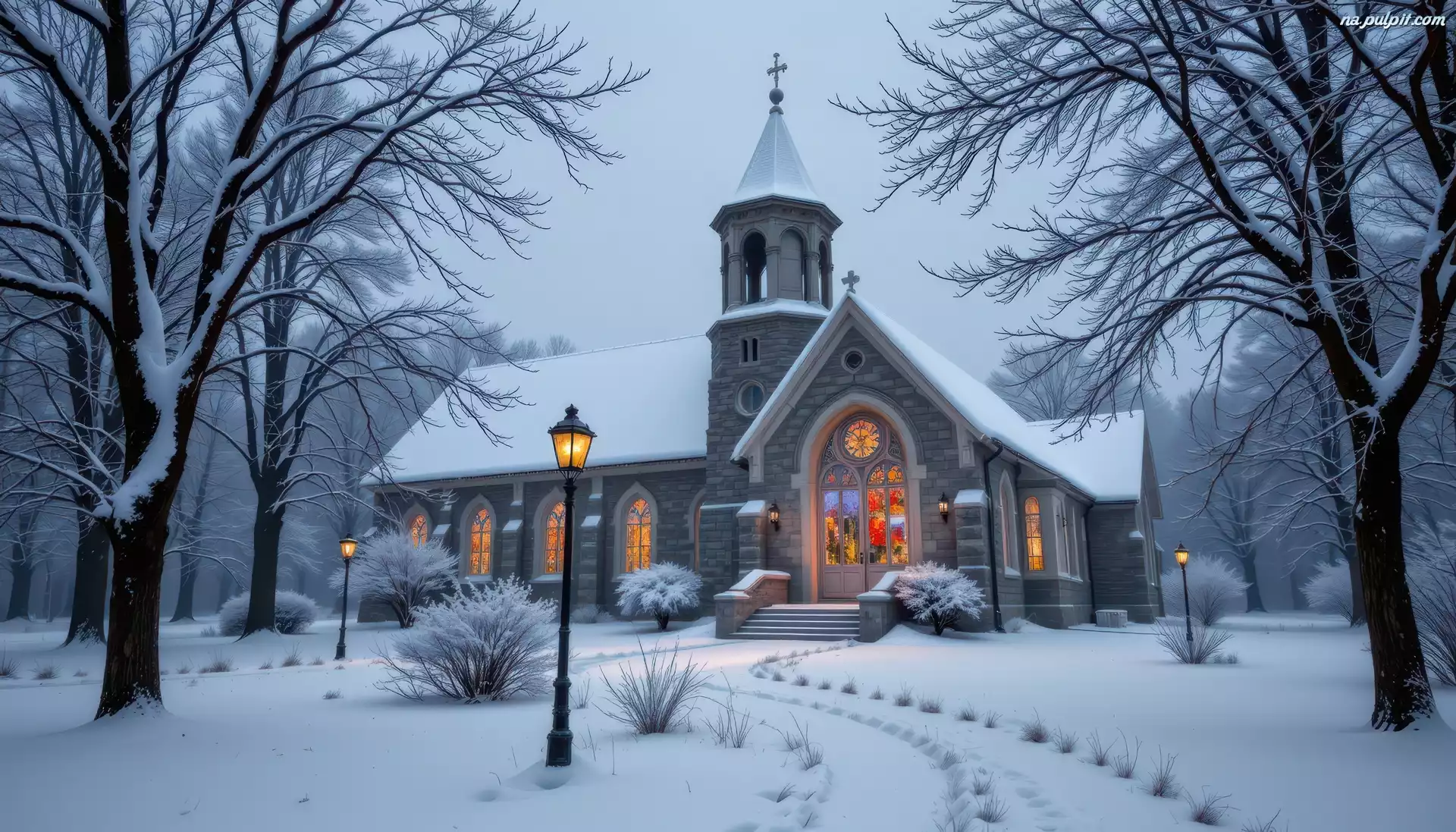 Latarnie, Zima, Kościół, Droga, Drzewa Na Pulpit
