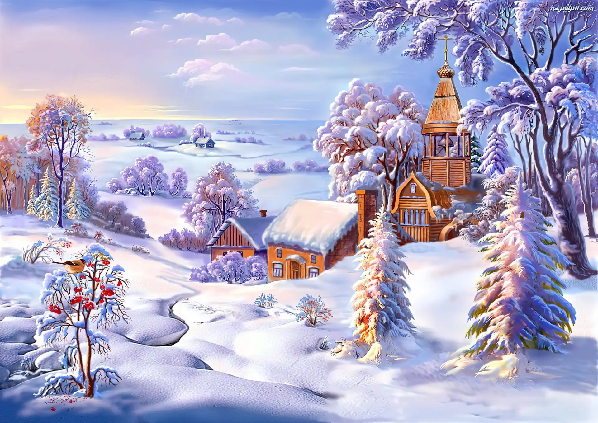 Zima, Drzewa, Kościółek, Śnieg Na Pulpit