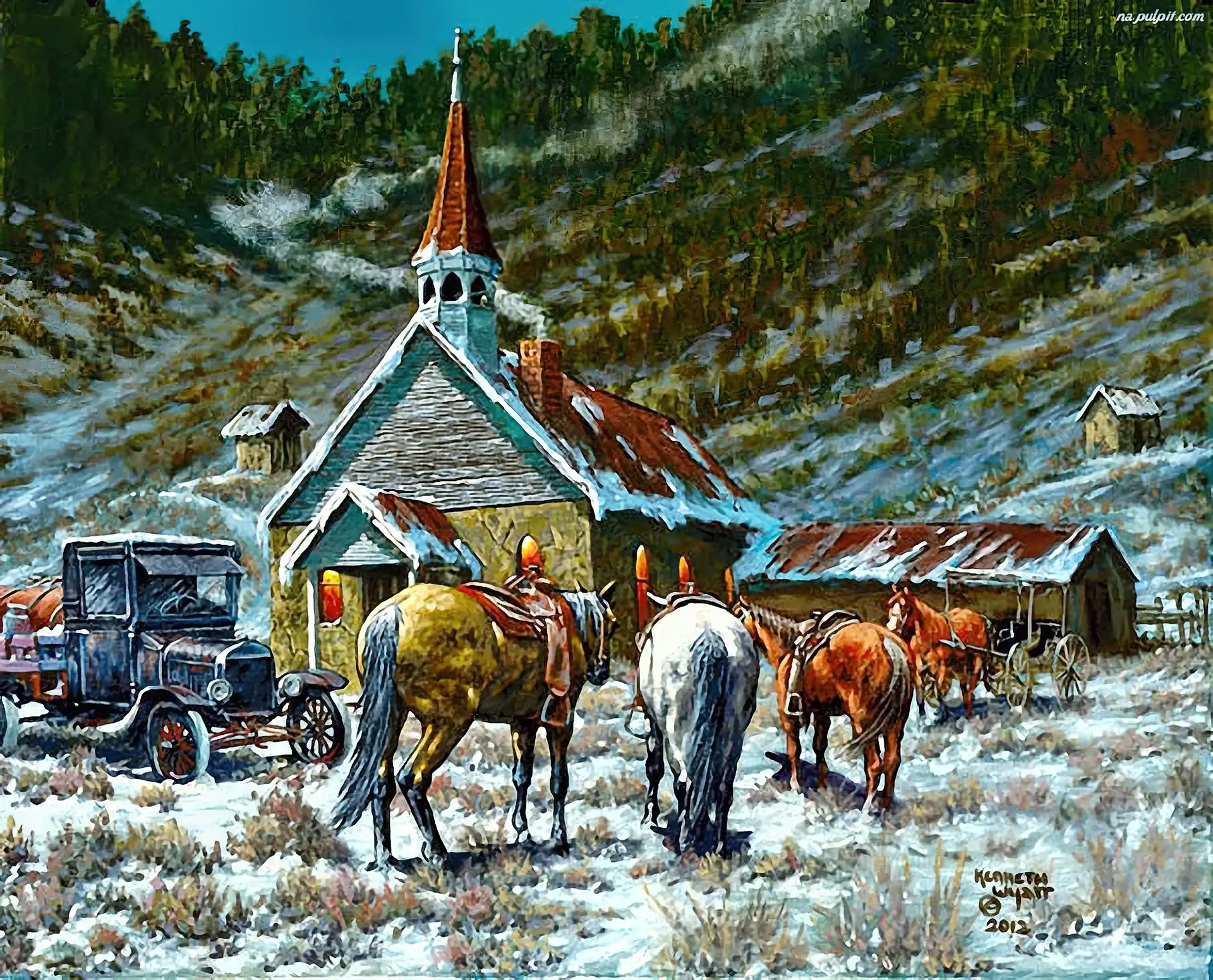 Zima, Auta, Konie, Kościółek, Góry Na Pulpit