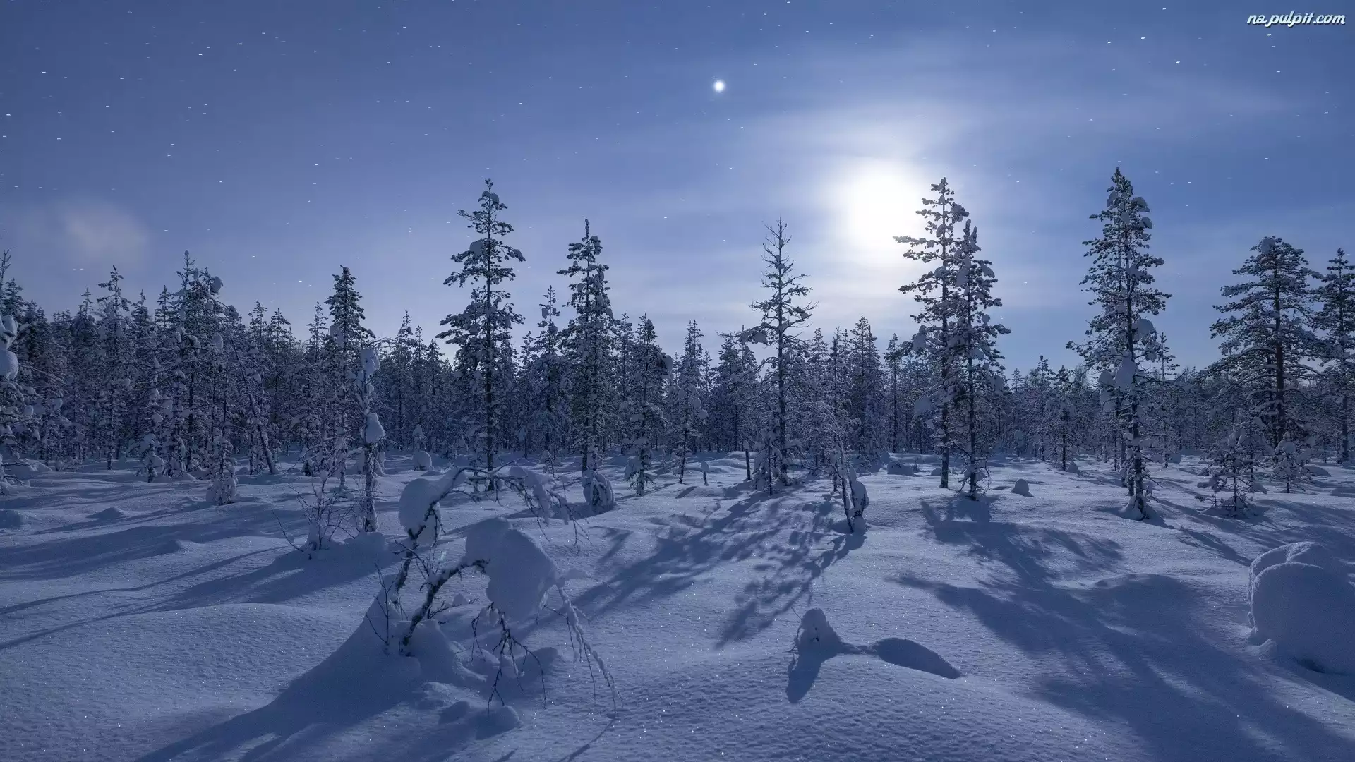 Drzewa, Gwiazdy, Księżyc, Zima, Noc, Las, Śnieg Na Pulpit