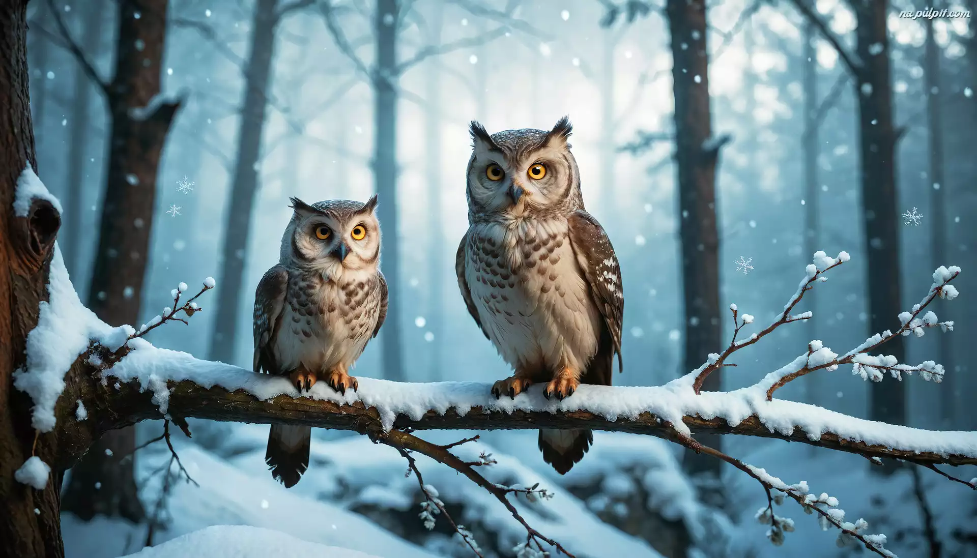 Sowy, Zima, Las, Gałąź, Dwie Na Pulpit