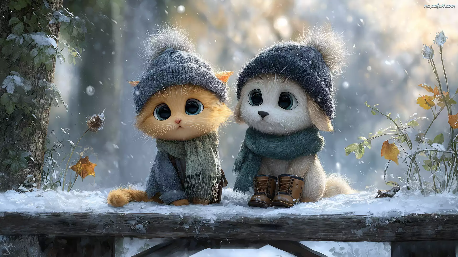 Grafika AI, Ławka, Ubranka, Kot, Pies, Czapki, Zima Na Pulpit