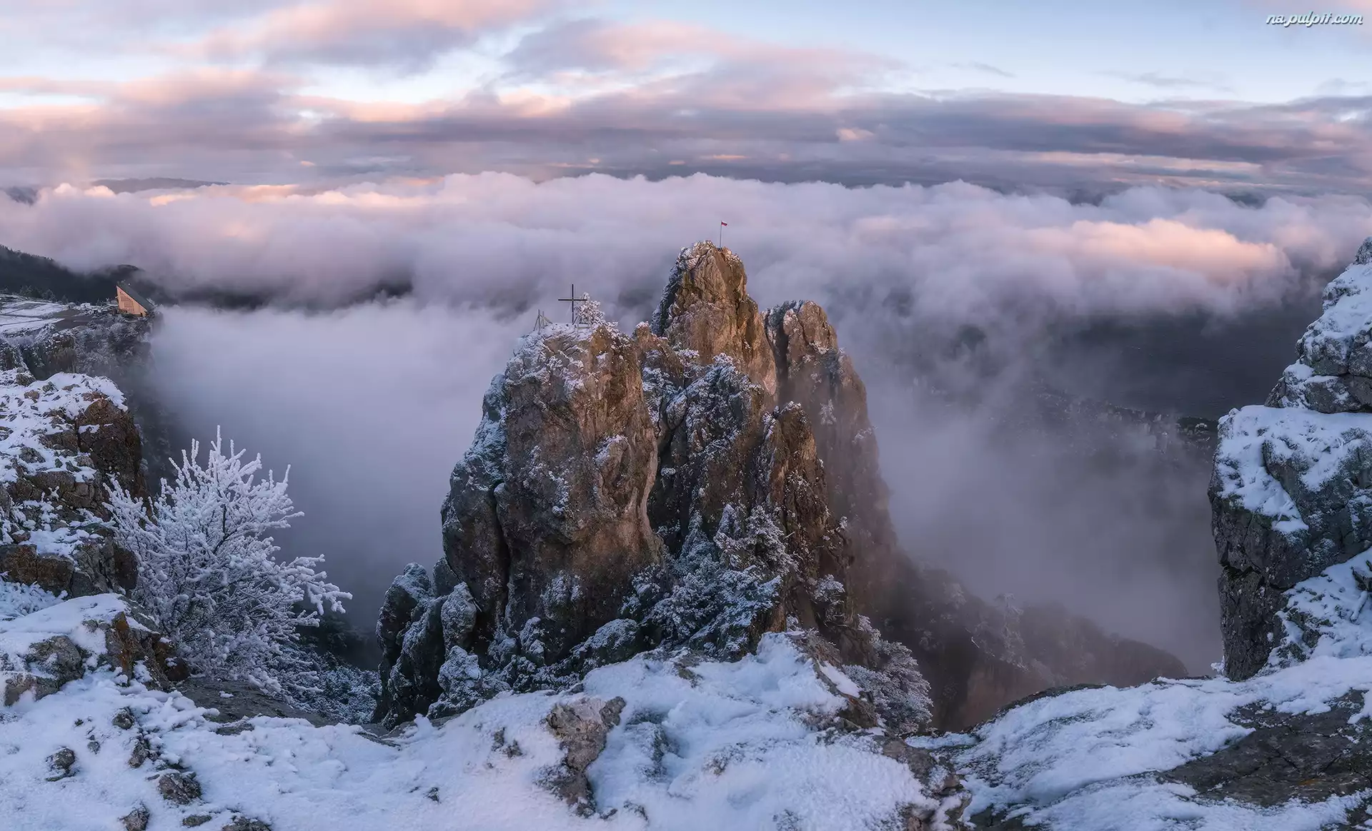 Krym, Szczyty Aj-Petri, Mgła, Krzyż, Skały, Góry Krymskie, Zima
