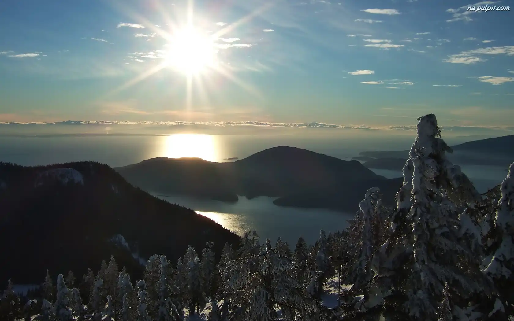 Zima, Promienie, Góry, Morze, Słońca Na Pulpit