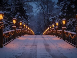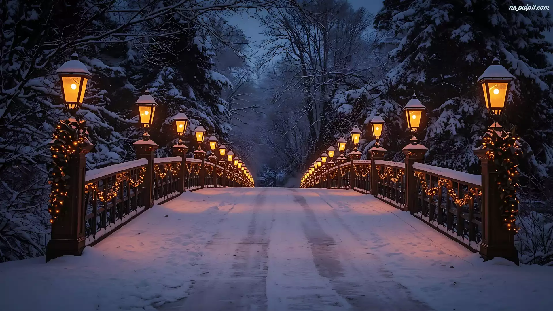 Latarnie, Zima, Most, Światełka, Drzewa Na Pulpit