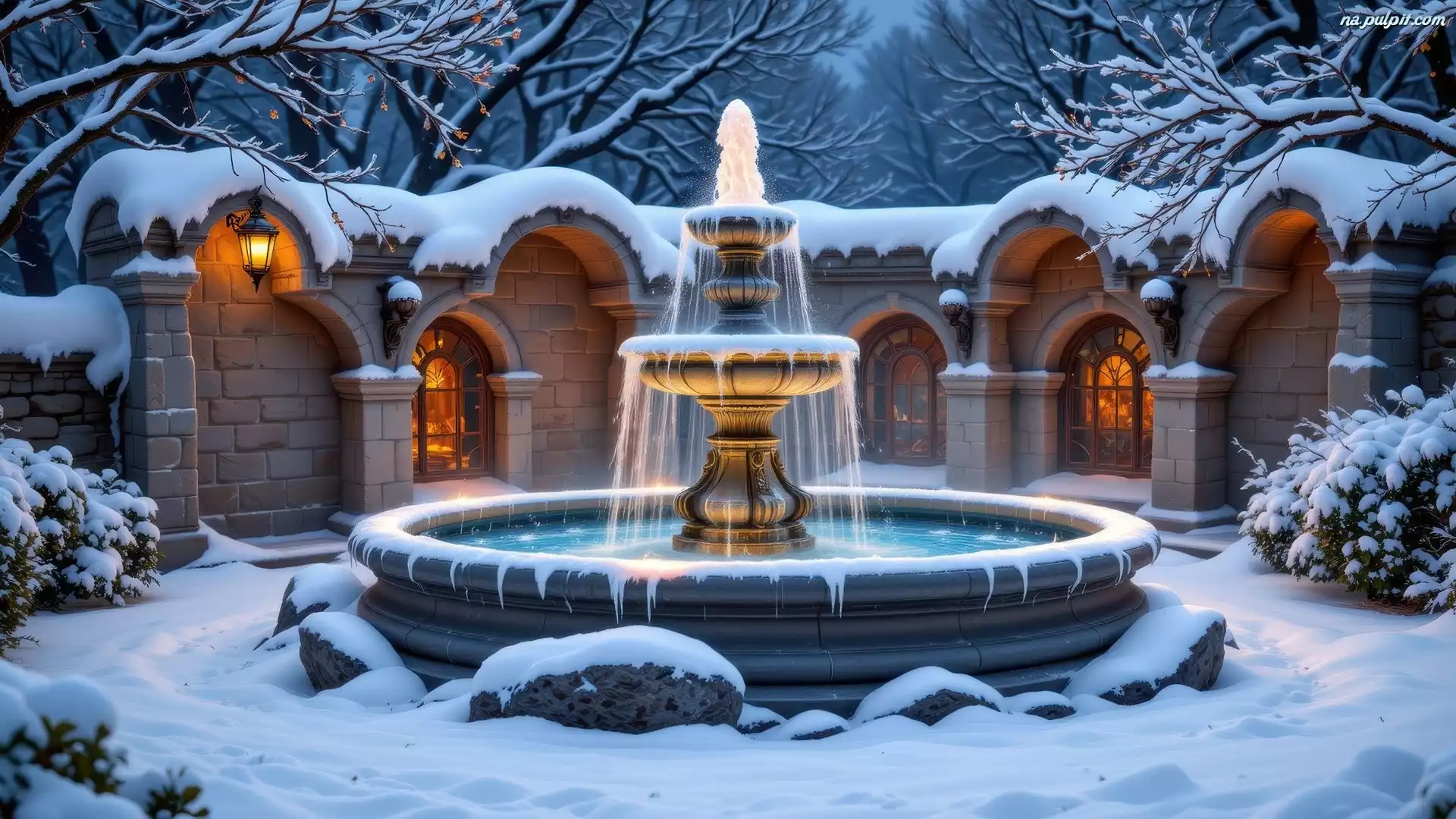 Krzewy, Lampion, Oświetlenie, Zima, Ośnieżona, Budowla, Fontanna Na Pulpit