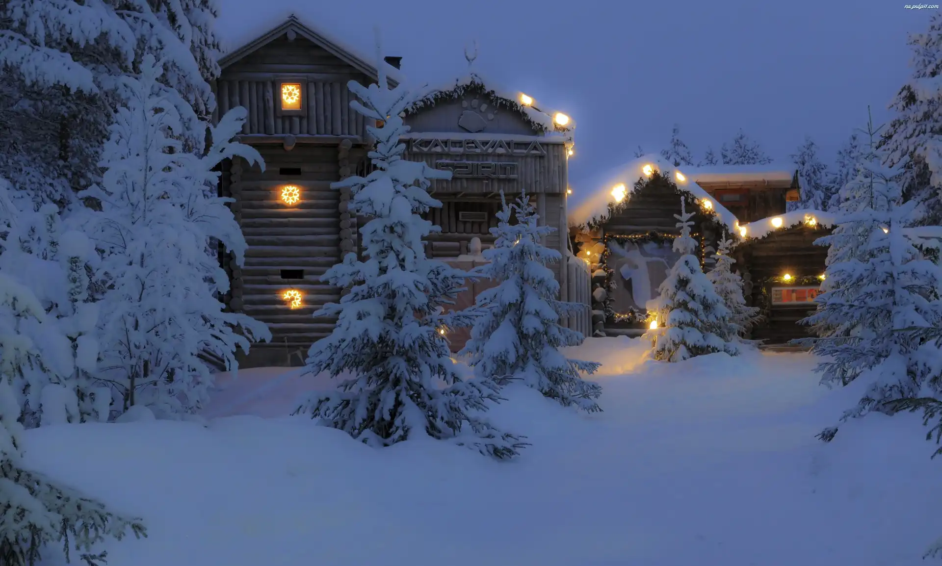 Zima, Domy, Oświetlone, Drzewa Na Pulpit