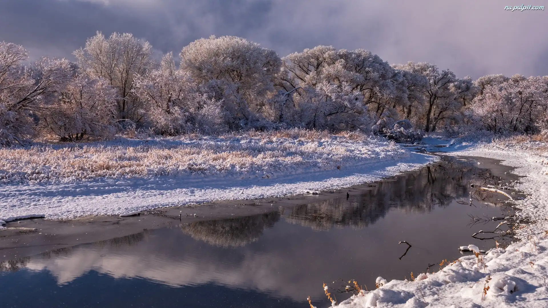 Zima, Krzewy, Drzewa, Oszronione, Rzeka