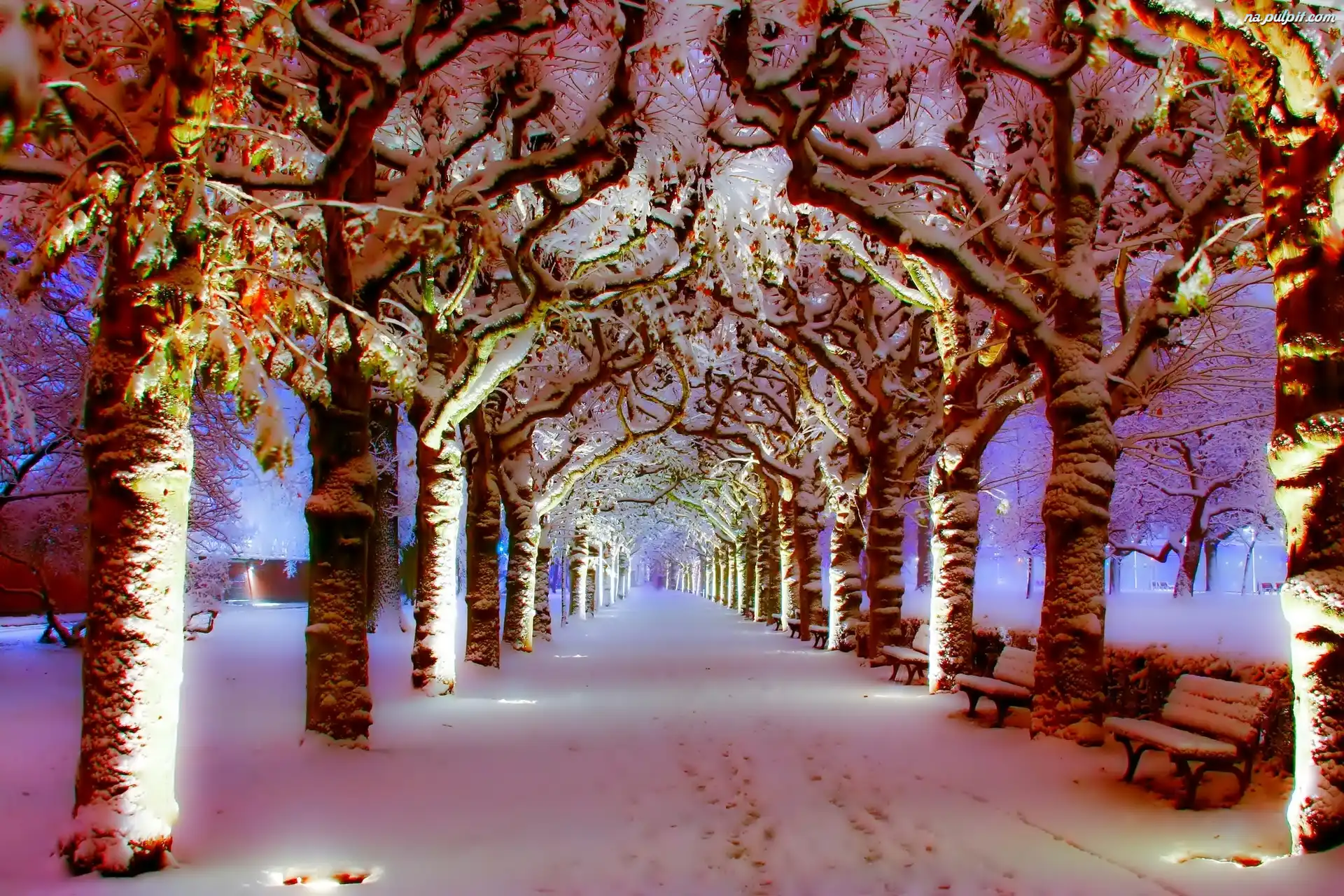 Ławki, Park, Zima, Alejka