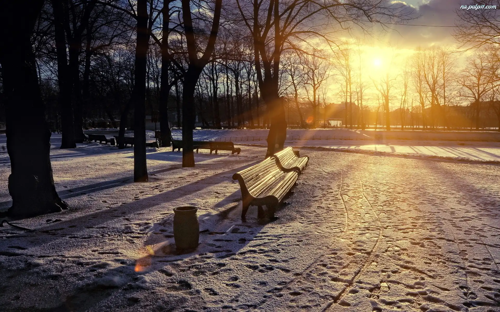 Zima, Ławki, Drzewa, Przebijające, Park, Słońce