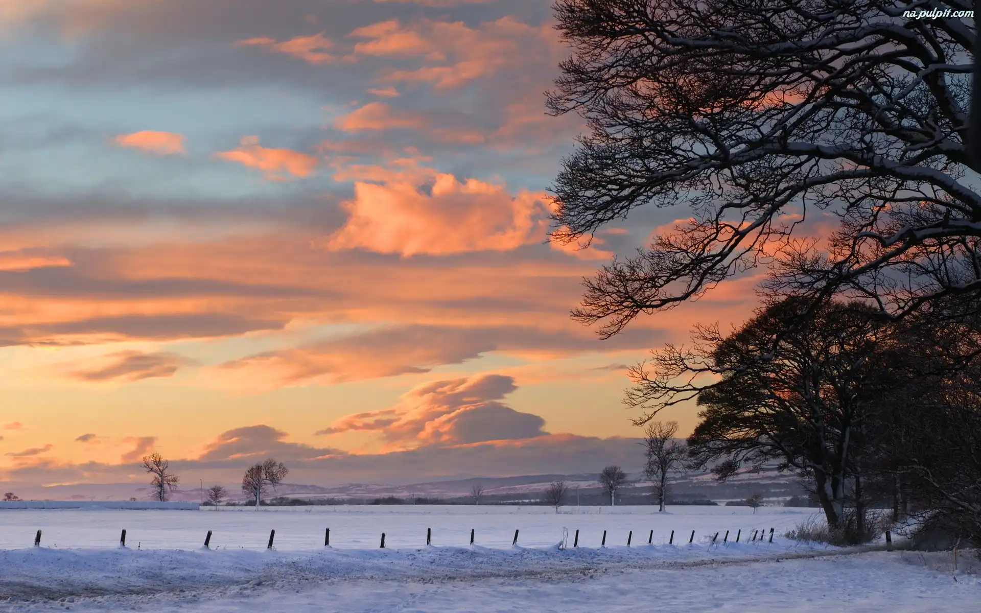 Zima, Drzewa, Góry, Pola, Chmury Na Pulpit