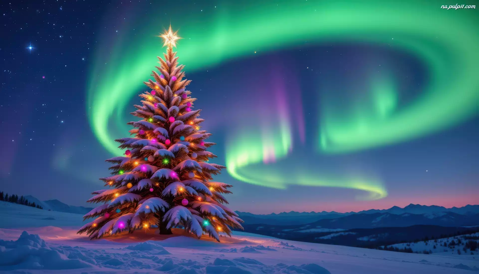 Boże Narodzenie, Choinka, Zima, Zorza polarna Na Pulpit