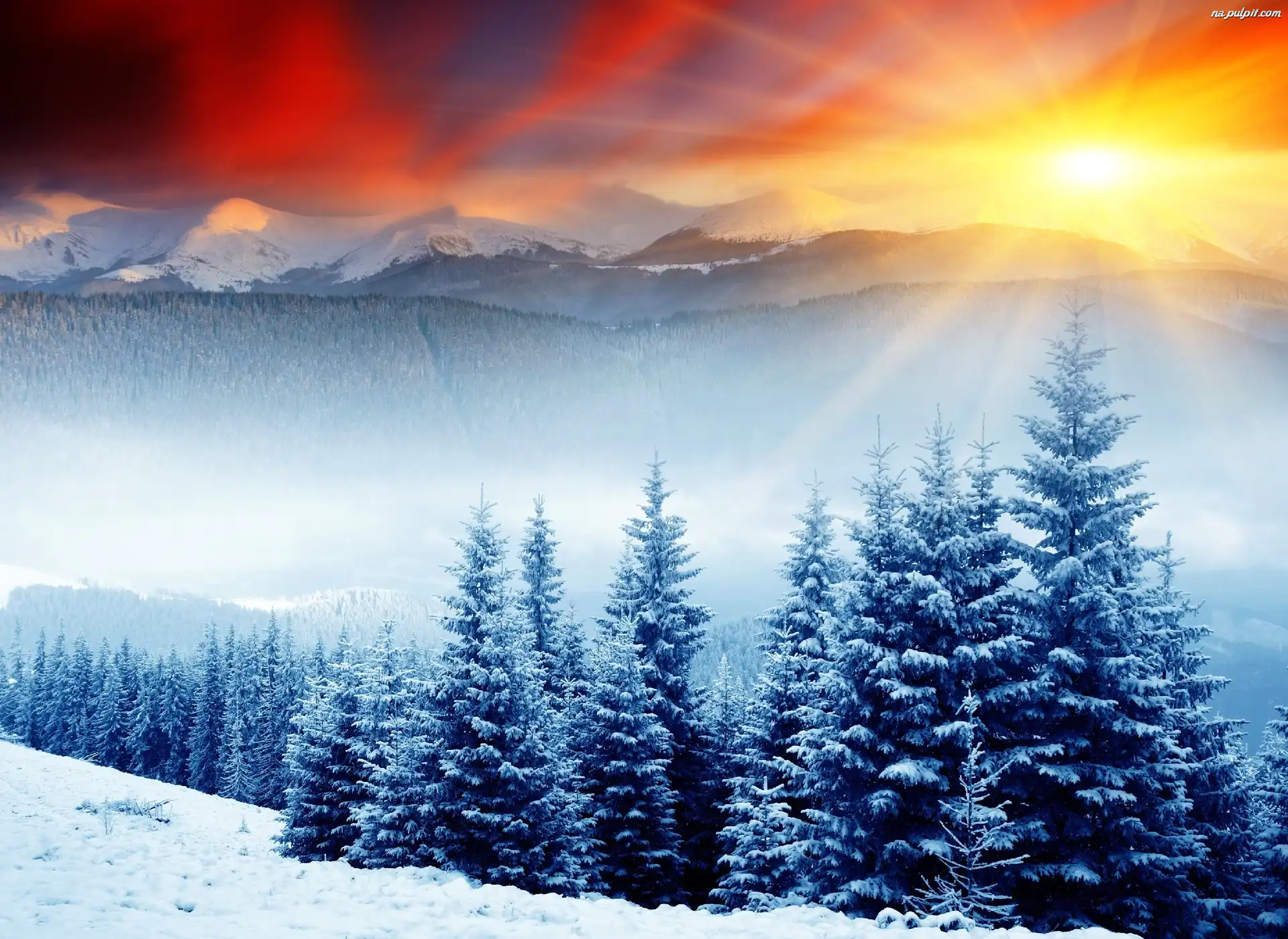 Zima, Góry, Słońca, Promienie, Las Na Pulpit