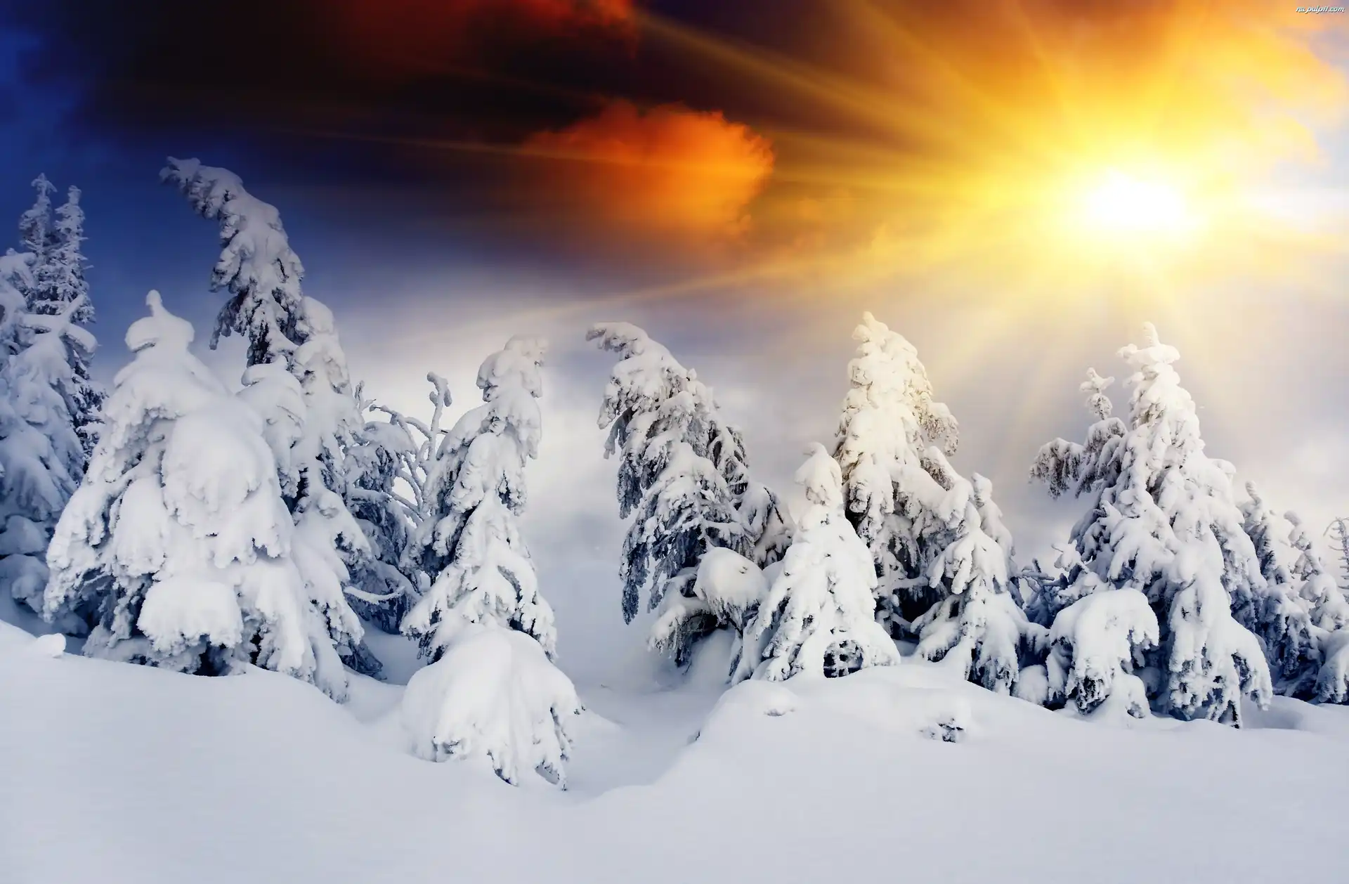 Zima, Świerki, Słońca, Promienie, Śnieg