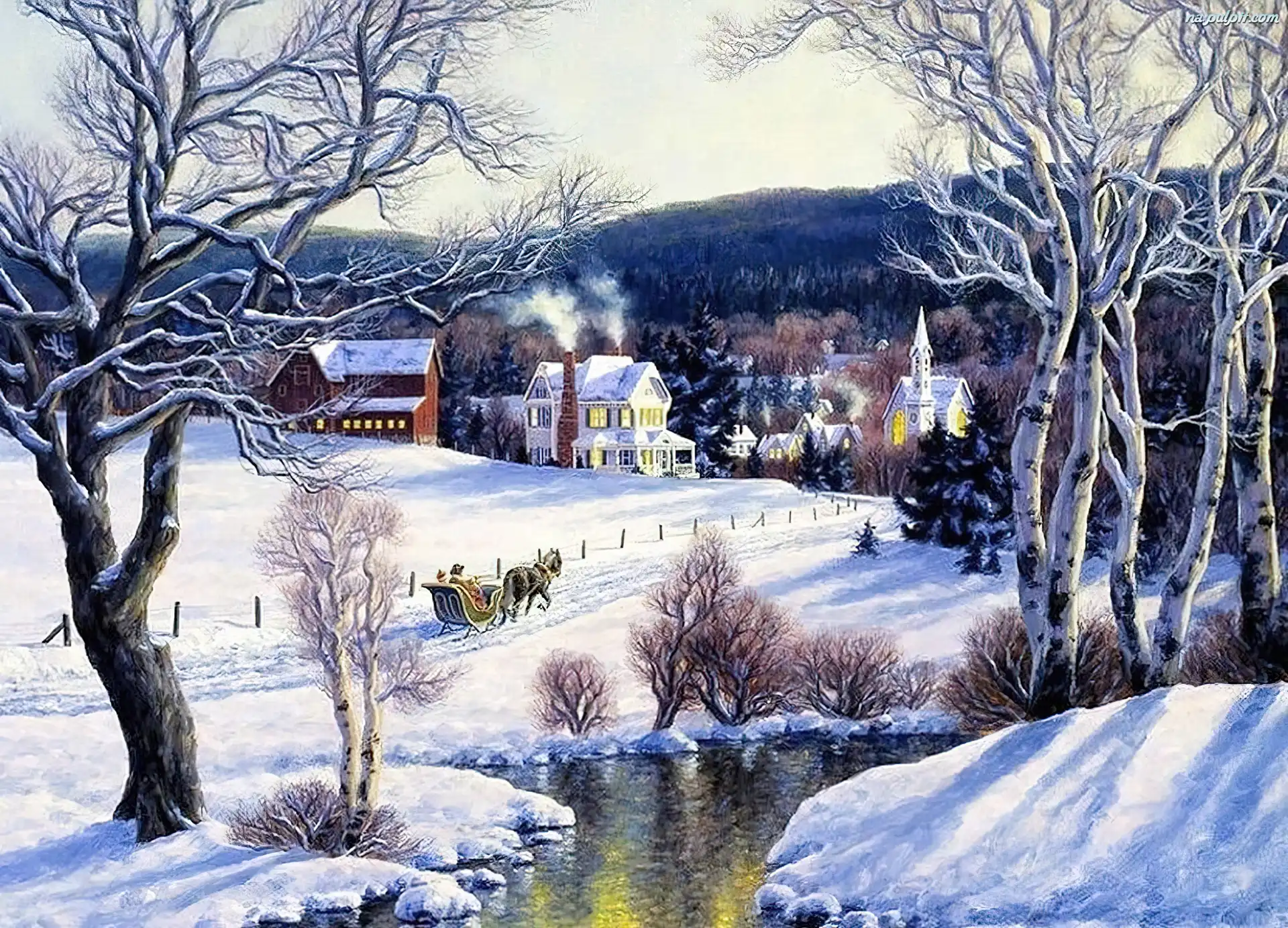 Zima, Sanie, Droga, Rzeka, Drzewa Na Pulpit