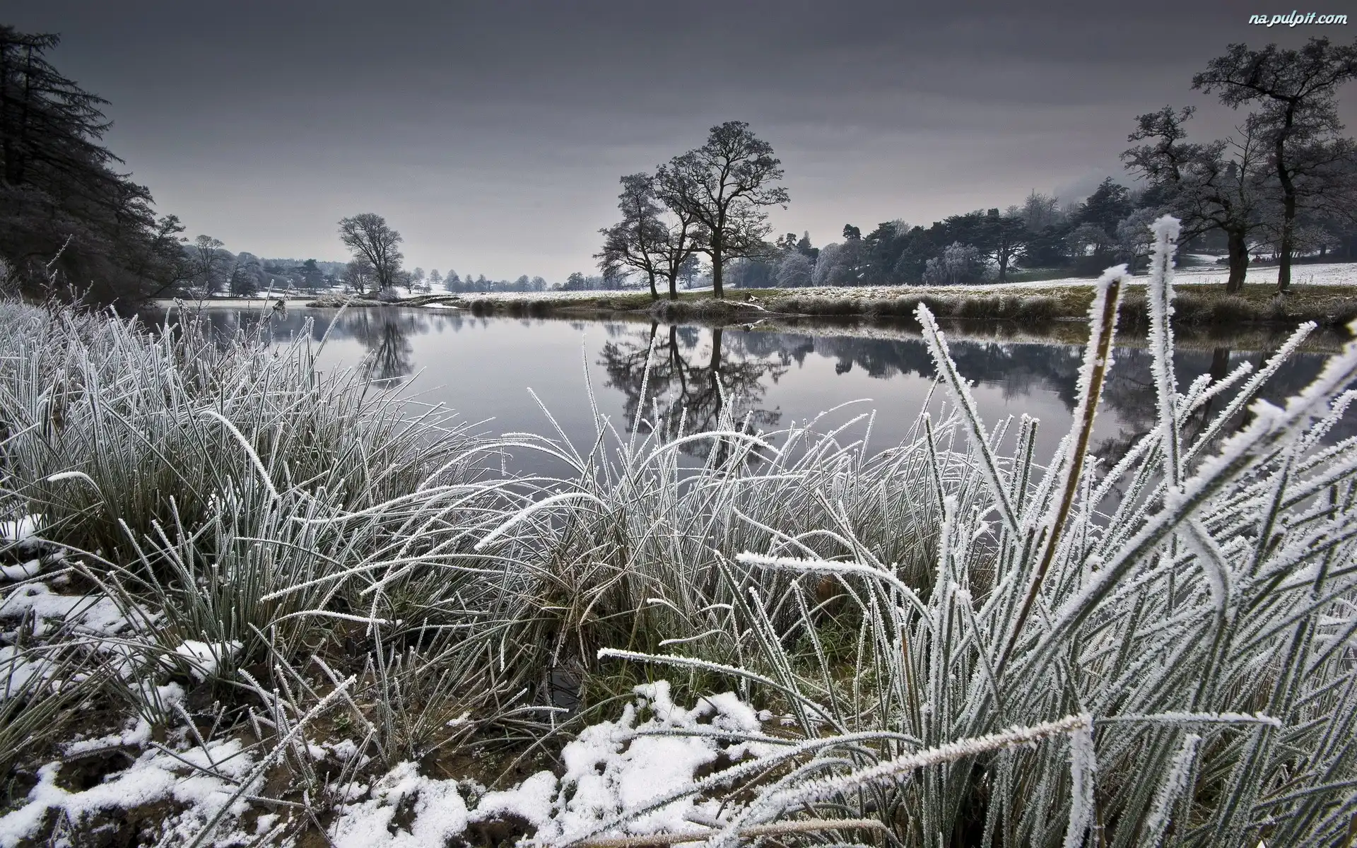 Zima, Drzewa, Rzeka, Trawy Na Pulpit