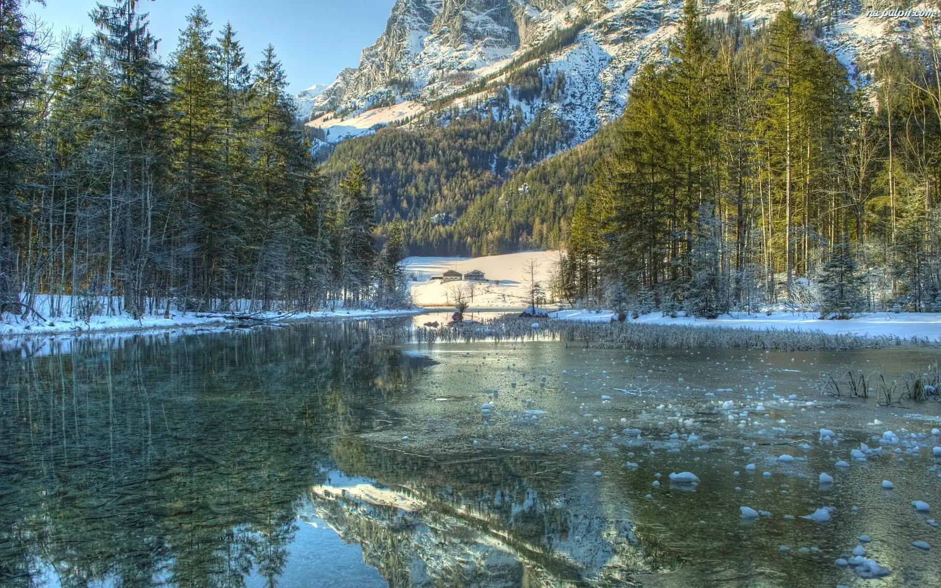 Zima, Góry, Rzeka, Choinki Na Pulpit