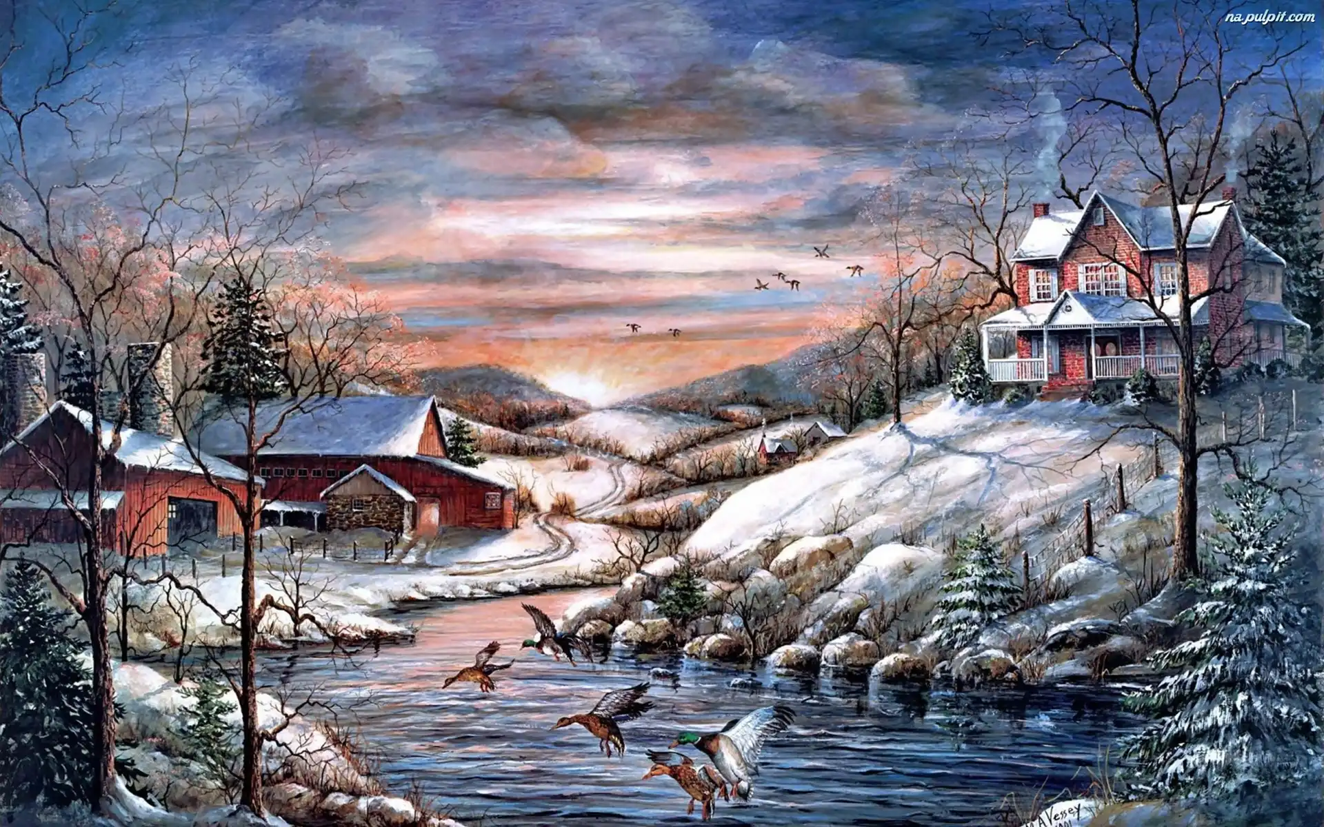 Zima, Kaczki, Rzeka, Domy Na Pulpit